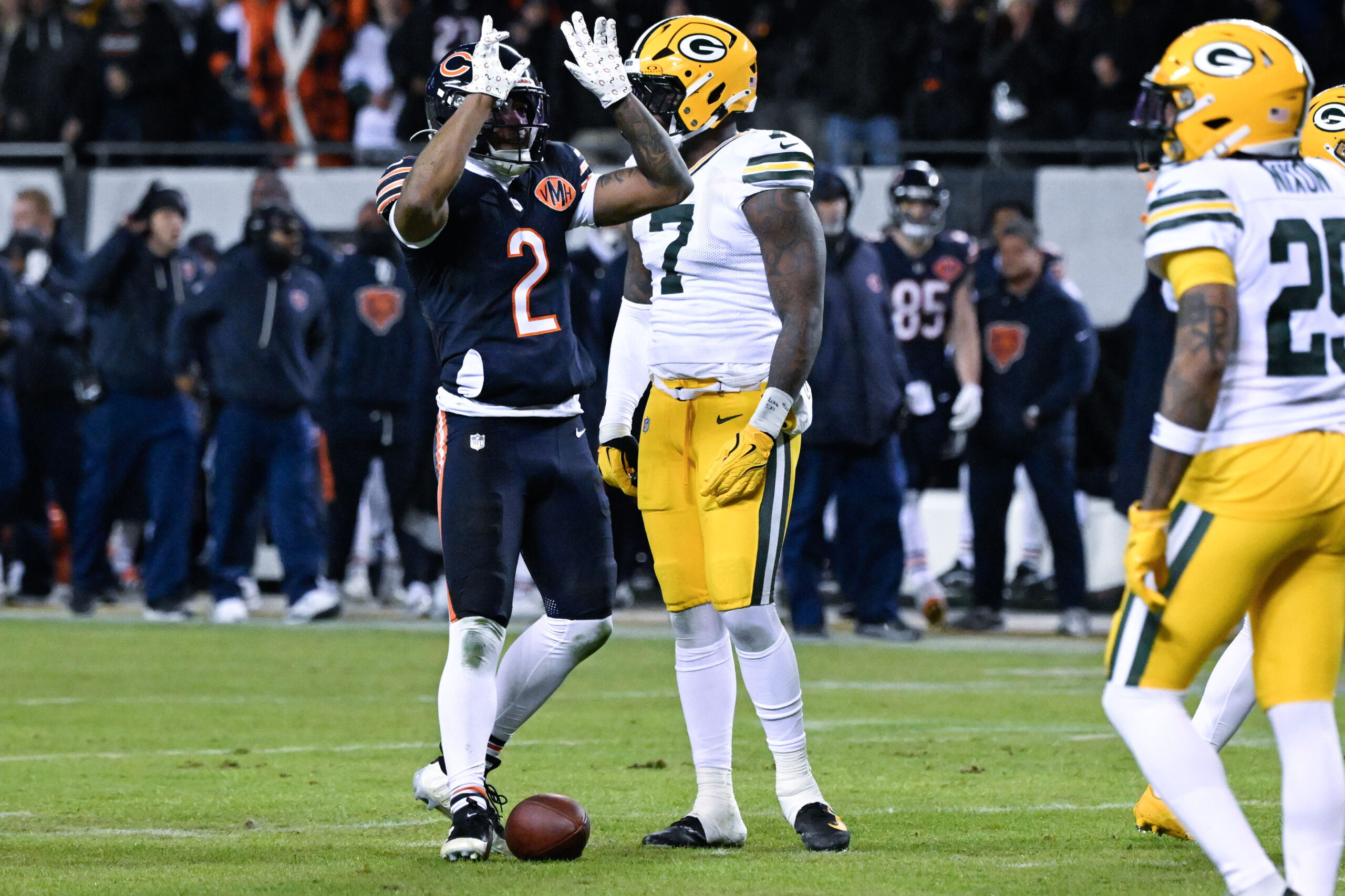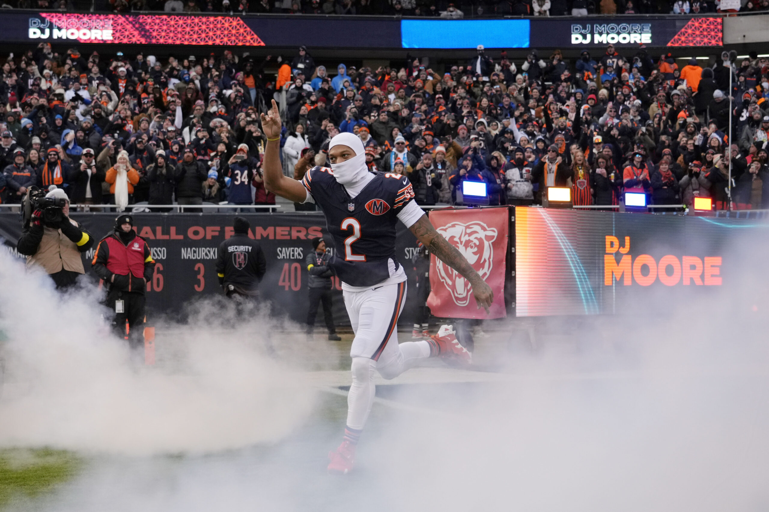 Jan 10, 2026; Chicago, IL, USA; in Chicago Bears wide receiver DJ Moore (2) signals after a carry during an NFC Wild Card Round game against the Green Bay Packers at Soldier Field. Mandatory Credit: Matt Marton-Imagn Images