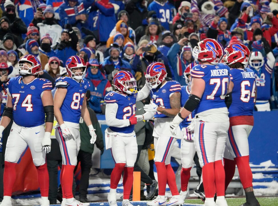 Bills running back Ty Johnson (26) celebrates with Gabe Davis and the rest of the offensive unit after his rushing touchdown in the fourth quarter against the New York Jets during the last regular season game at Highmark Stadium in Orchard Park Sunday, Jan. 4, 2026 -Imagn Images
