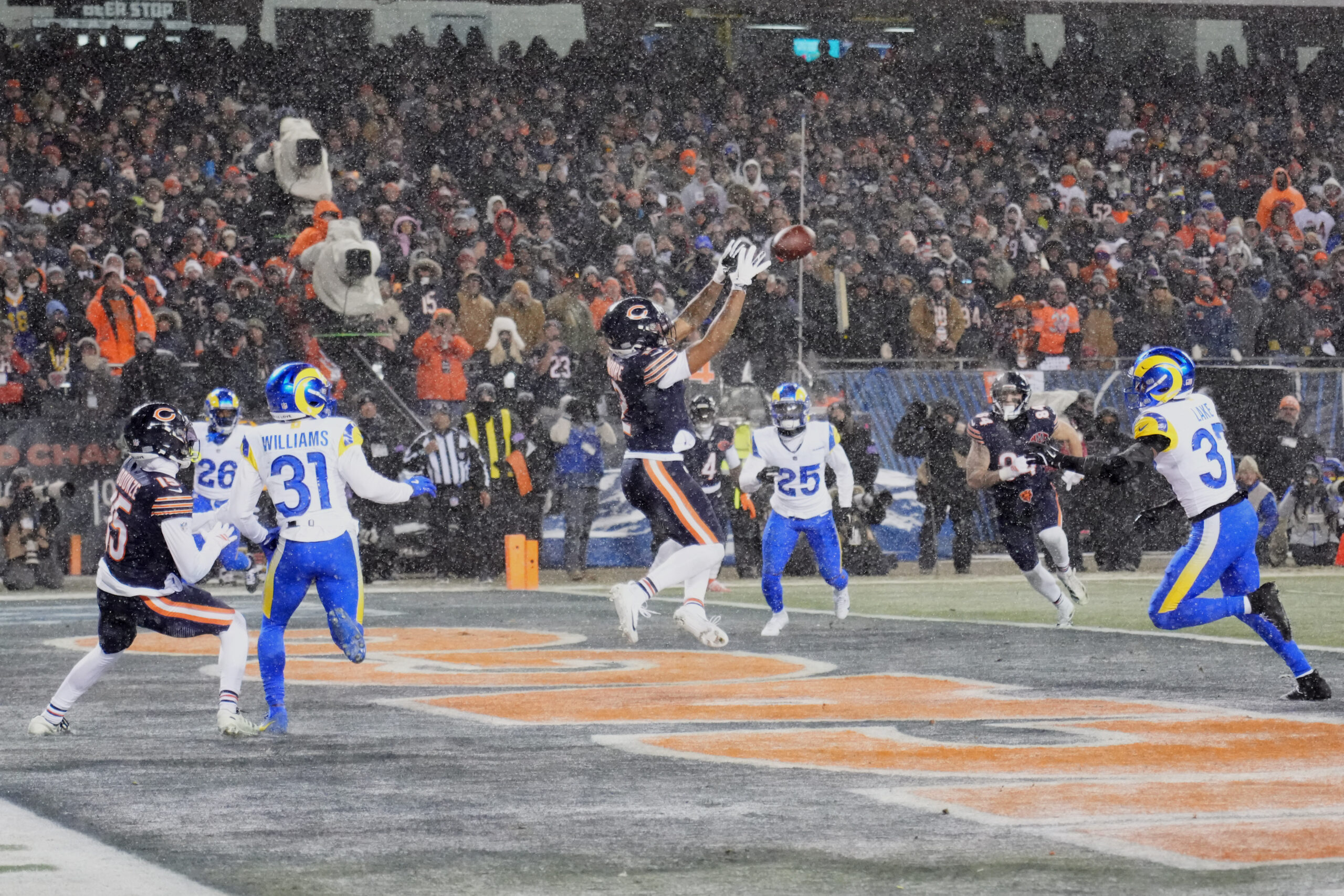 Jan 18, 2026; Chicago, IL, USA; Chicago Bears wide receiver DJ Moore (2) catches a three-yard touchdown pass thrown by quarterback Caleb Williams (not pictured) against Los Angeles Rams safety Quentin Lake (37) and cornerback Darious Williams (31) during the second quarter of an NFC Divisional Round game at Soldier Field. Mandatory Credit: David Banks-Imagn Images