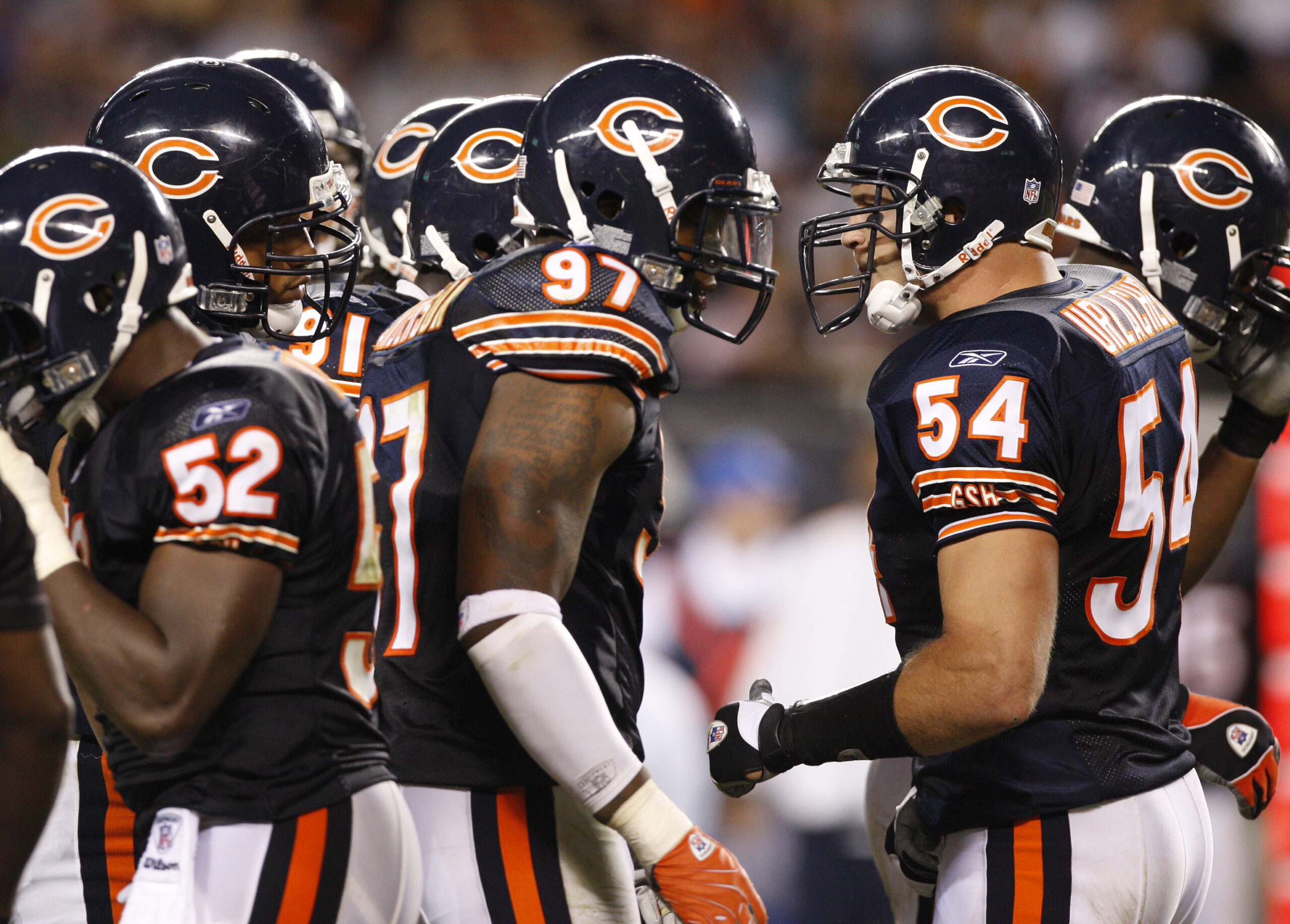 Sep 23, 2007; Chicago, IL, USA; Chicago Bears linebacker Brian Urlacher (54) in the huddel with teammates against the Dallas Cowboys at Soldier Field Stadium. Mandatory Credit: Matthew Emmons-Imagn Images