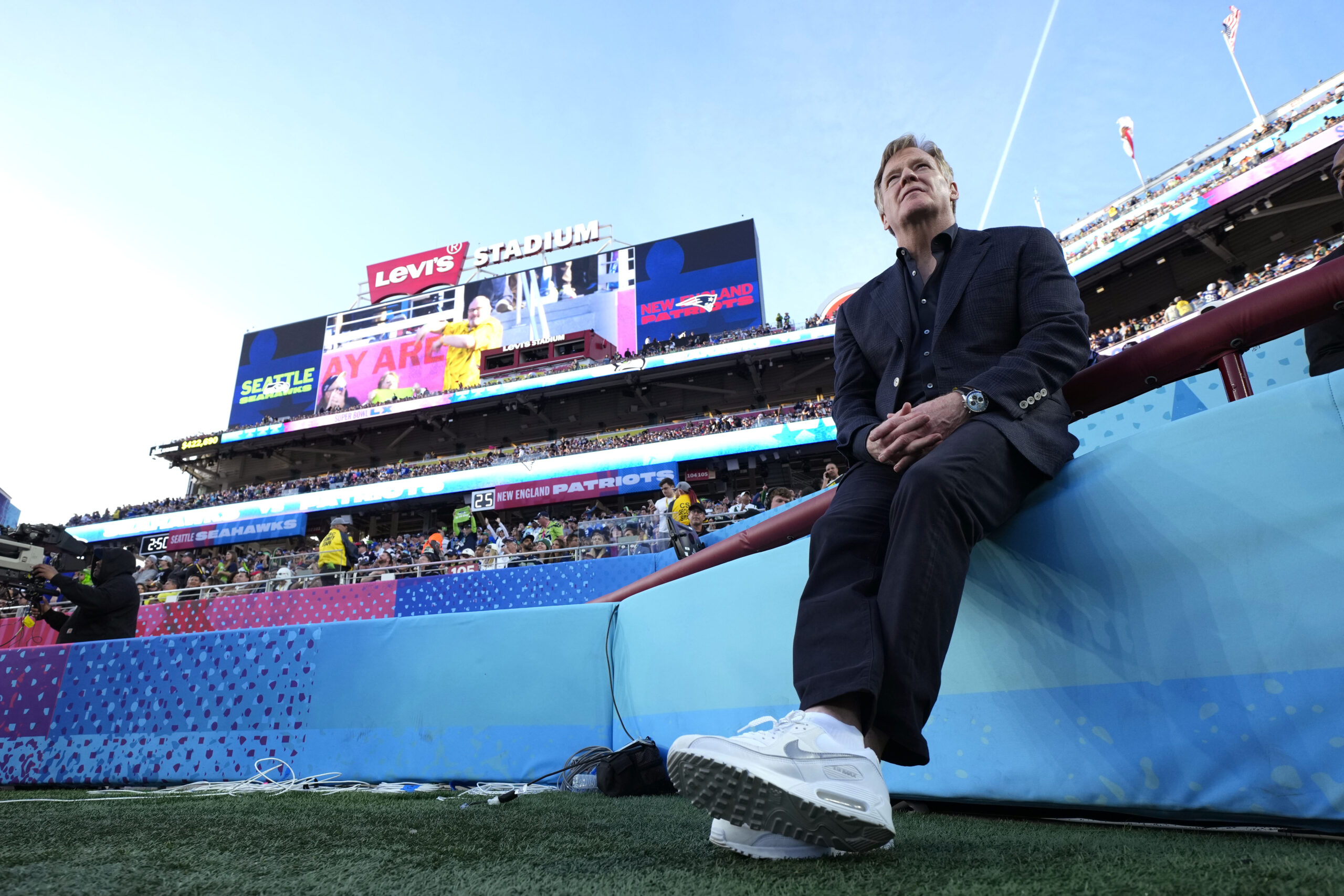 Feb 8, 2026; Santa Clara, CA, USA; NFL commissioner Roger Goodell looks on in Super Bowl LX between the Seattle Seahawks and the New England Patriots at Levi’s Stadium. Mandatory Credit: Kyle Terada-Imagn Images