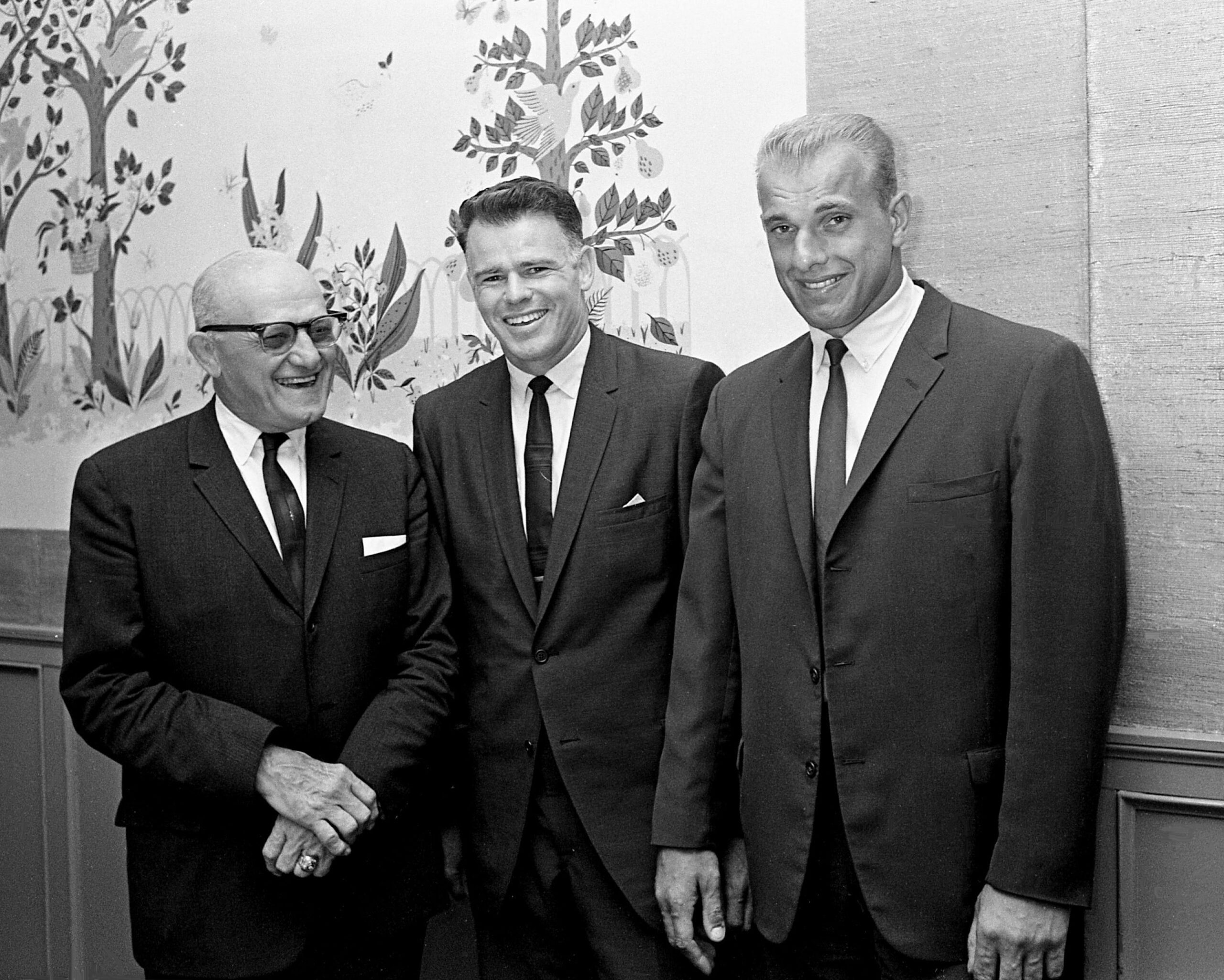 Chicago Bears quarterback Bill Wade, center, is being in charge here even though Bears head coach George Halas, left, and defensive star Dick Evey, the former Tennessee great, are present. Wade, a local favorite who starred at Vanderbilt, was host of a dinner on Aug. 27, 1965, for the Bears after the team arrived in town for their NFL exhibition with the Los Angeles Rams.