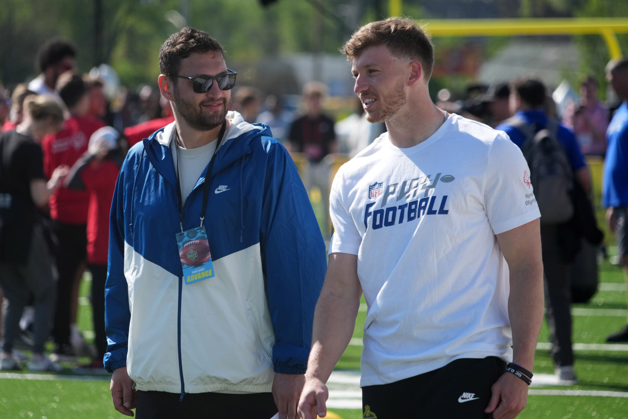 Apr 22, 2026; Pittsburgh, PA, USA; NFL director of football communications Sam Drexler (left) and Oregon Ducks defensive back Dillon Thieneman during the NFL Draft prospects clinic at Hazelwood Green Park. Mandatory Credit: Kirby Lee-Imagn Images