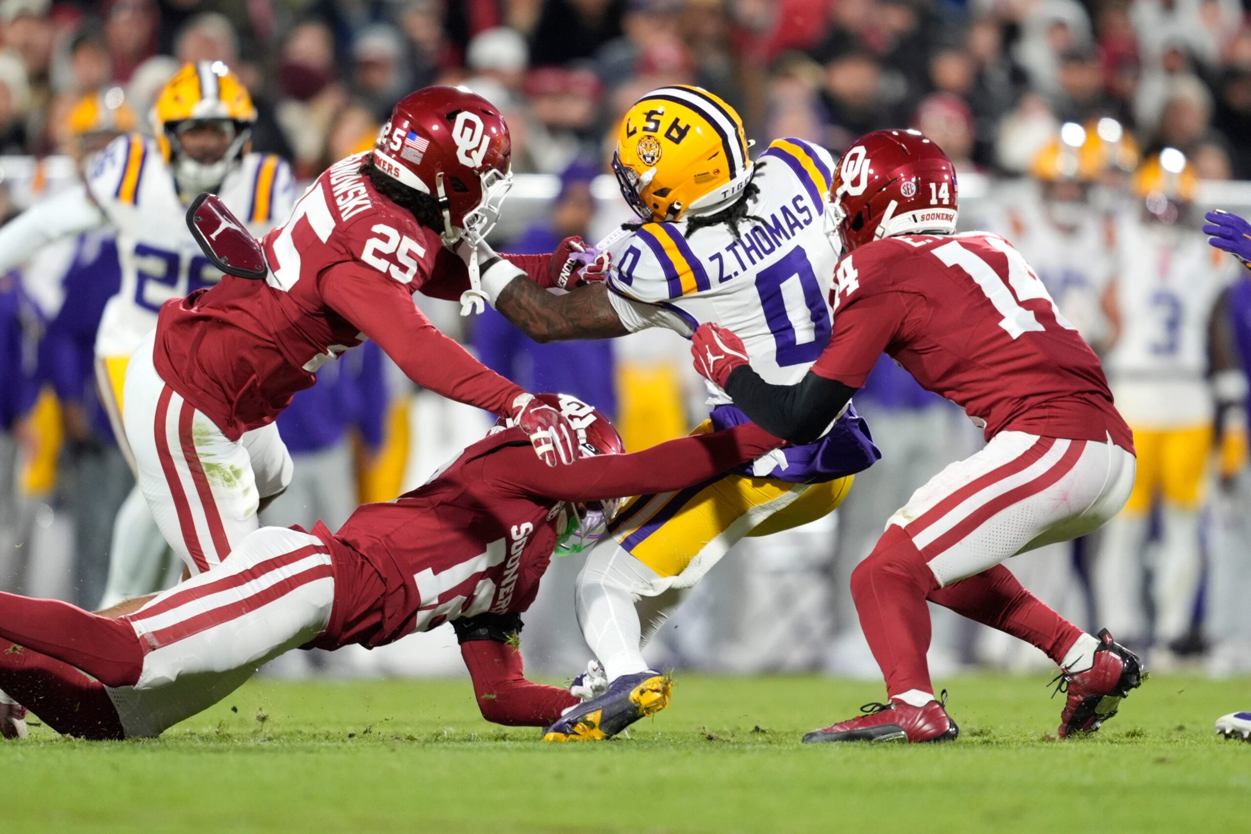 Oklahoma Sooners defensive back Michael Boganowski (25), defensive back Devon Jordan (12) and defensive back Trystan Haynes (14) bring down Louisiana State Tigers wide receiver Zavion Thomas (0) during a college football game between the University of Oklahoma Sooners (OU) and the LSU Tigers at Gaylord Family – Oklahoma Memorial Stadium in Norman, Okla., Saturday, Nov. 29, 2025. Oklahoma won 17-13.