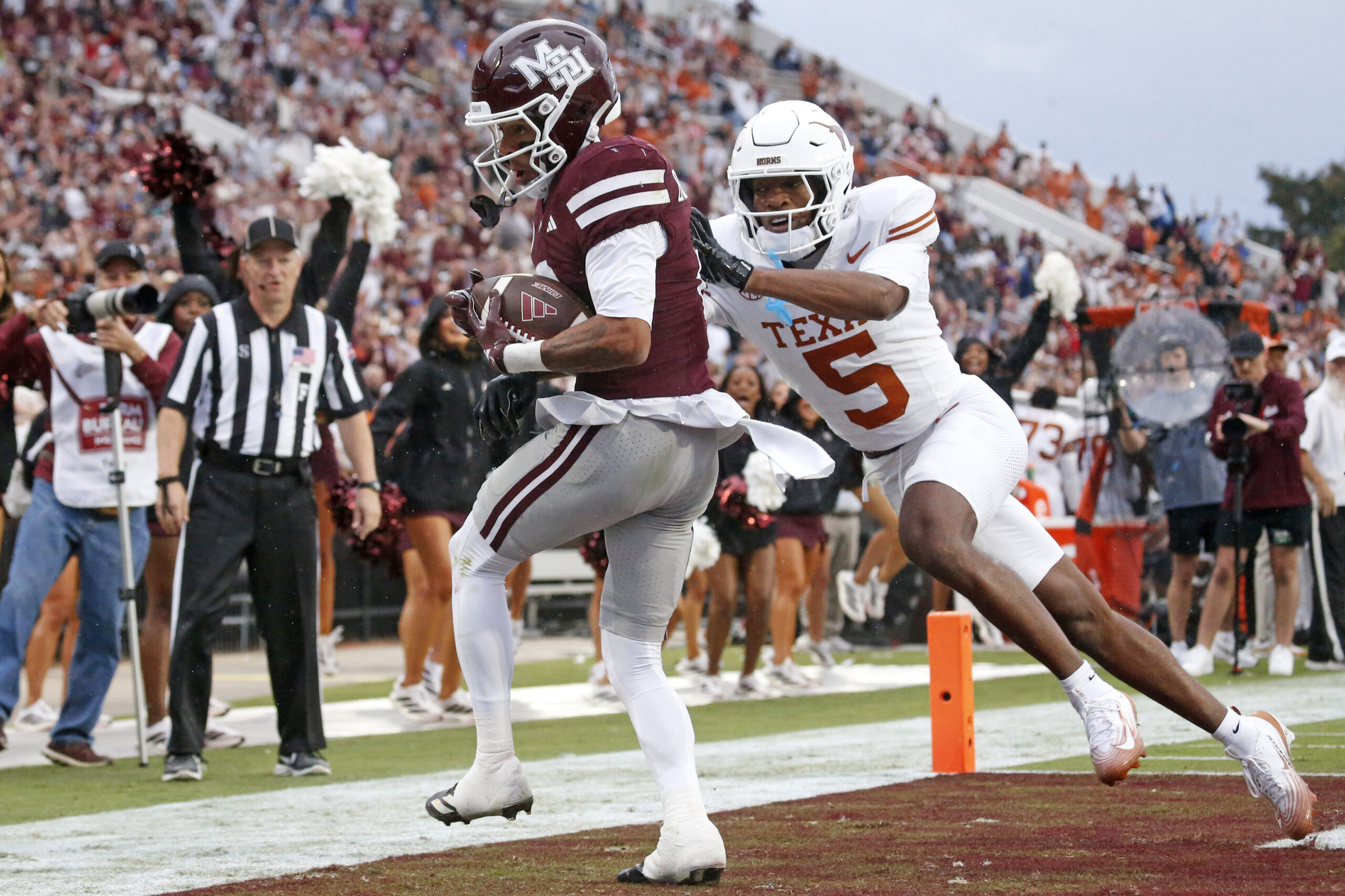 Oct 25, 2025; Starkville, Mississippi, USA; Mississippi State Bulldogs wide receiver Brenen Thompson (0) catches the ball for a touchdown over Texas Longhorns defensive back Malik Muhammad (5) during the second quarter at Davis Wade Stadium at Scott Field. Mandatory Credit: Petre Thomas-Imagn Images