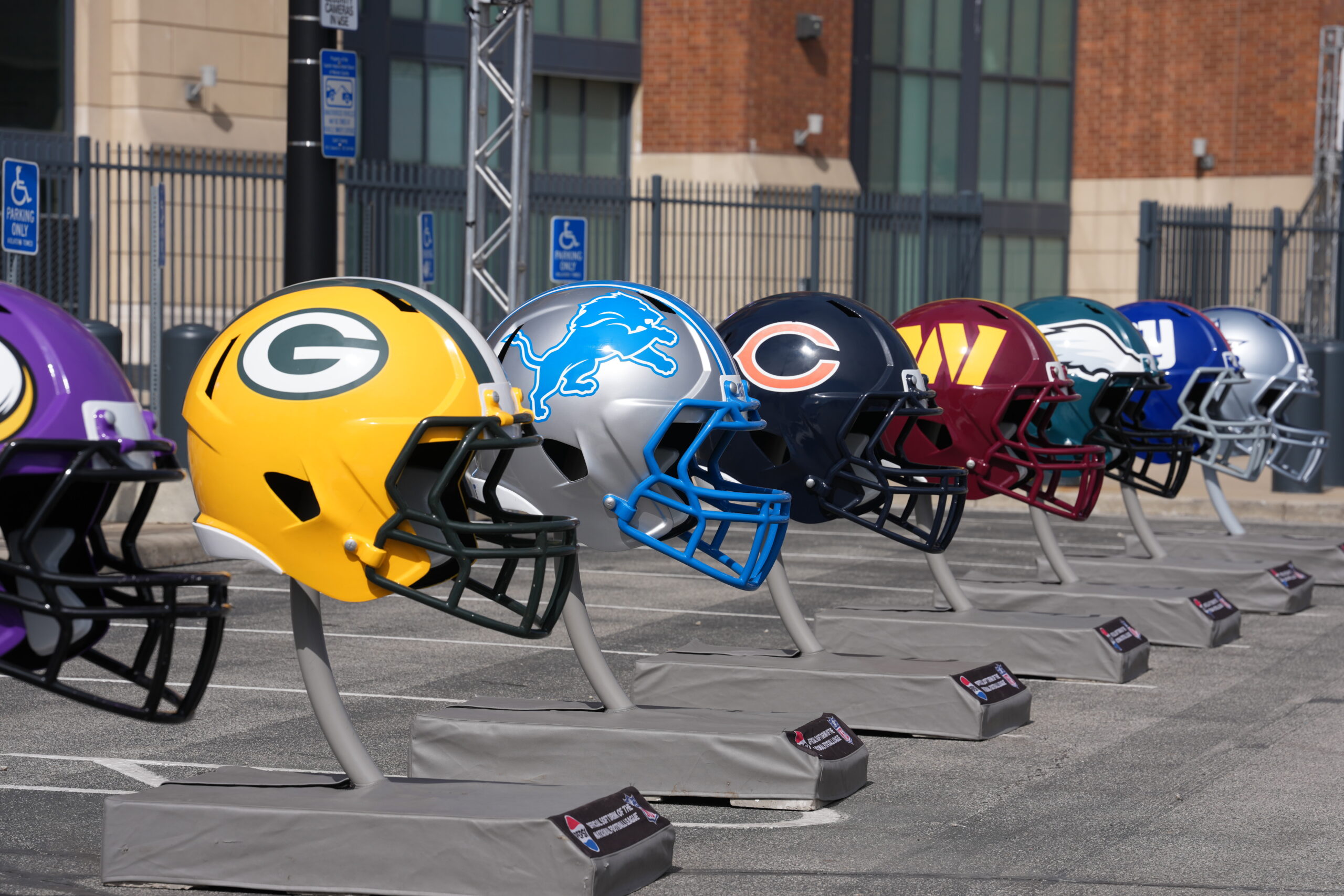 Feb 26, 2026; Indianapolis, IN, USA; Large helmets of the Green Bay Packers, Detroit Lions, Chicago Beras, Washington Commanders and Philadelphia Eagles at the NFL Scouting Combine at Lucas Oil Stadium. Mandatory Credit: Kirby Lee-Imagn Images