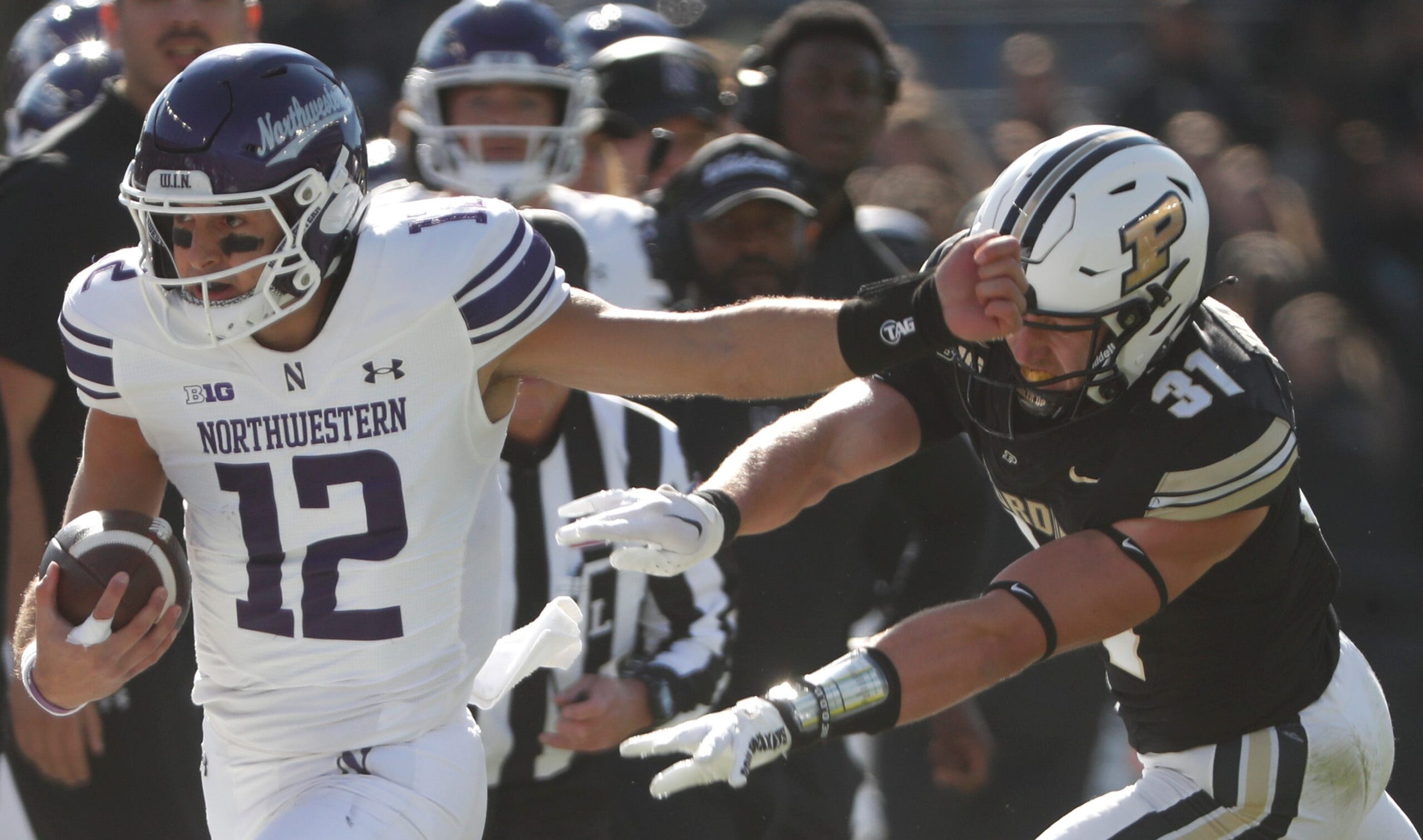 Purdue Boilermakers defensive back Dillon Thieneman (31) pushes Northwestern Wildcats quarterback Jack Lausch (12) out of bounds Saturday, Nov. 2, 2024, during the NCAA football game at Ross-Ade Stadium in West Lafayette, Ind.