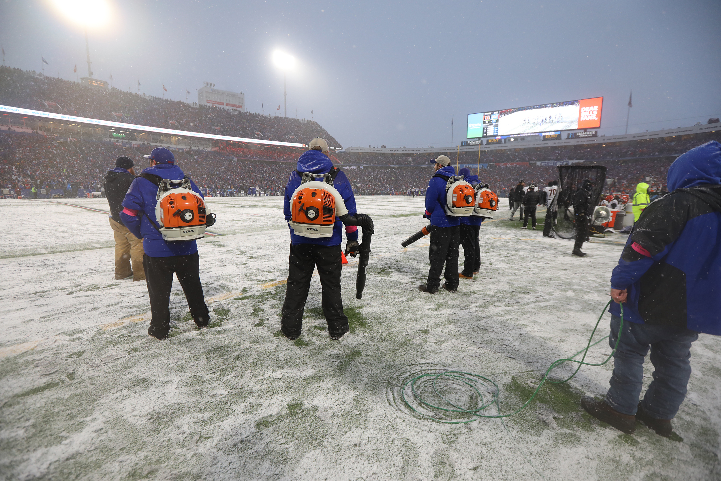 Jan 22, 2023; Orchard Park, New York, USA; Workers with leaf blowers took to the field during every commercial break to clear the yardage markers during an AFC divisional round game at Highmark Stadium. Mandatory Credit: Kareem Elgazzar-Imagn Images