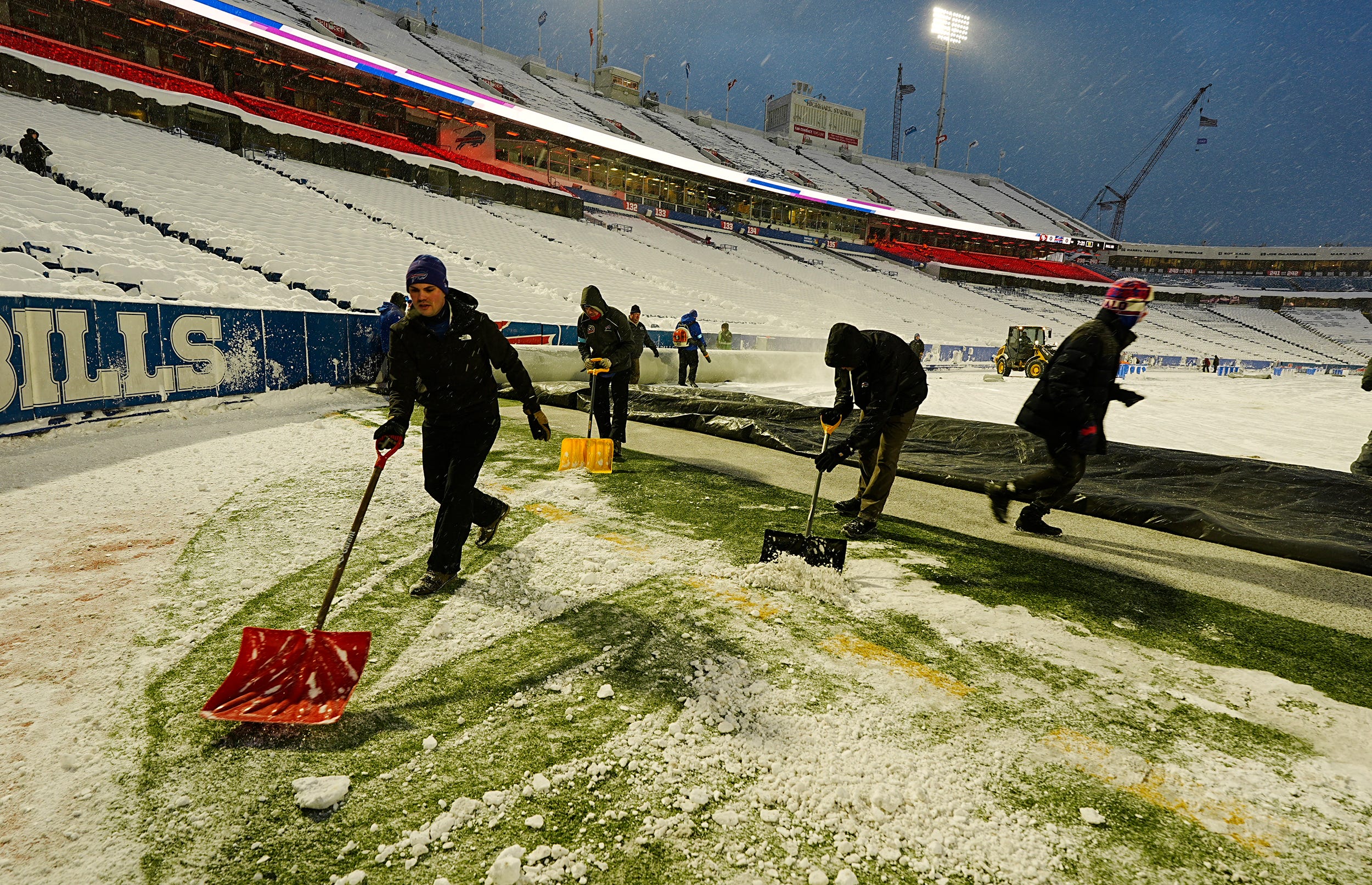 Workers shovel snow off to the sidelines as the tarp covering the field slowly gets pulled back before tonight’s Bills home game against the San Francisco 49ers in Orchard Park on Dec. 1, 2024.-Imagn Images