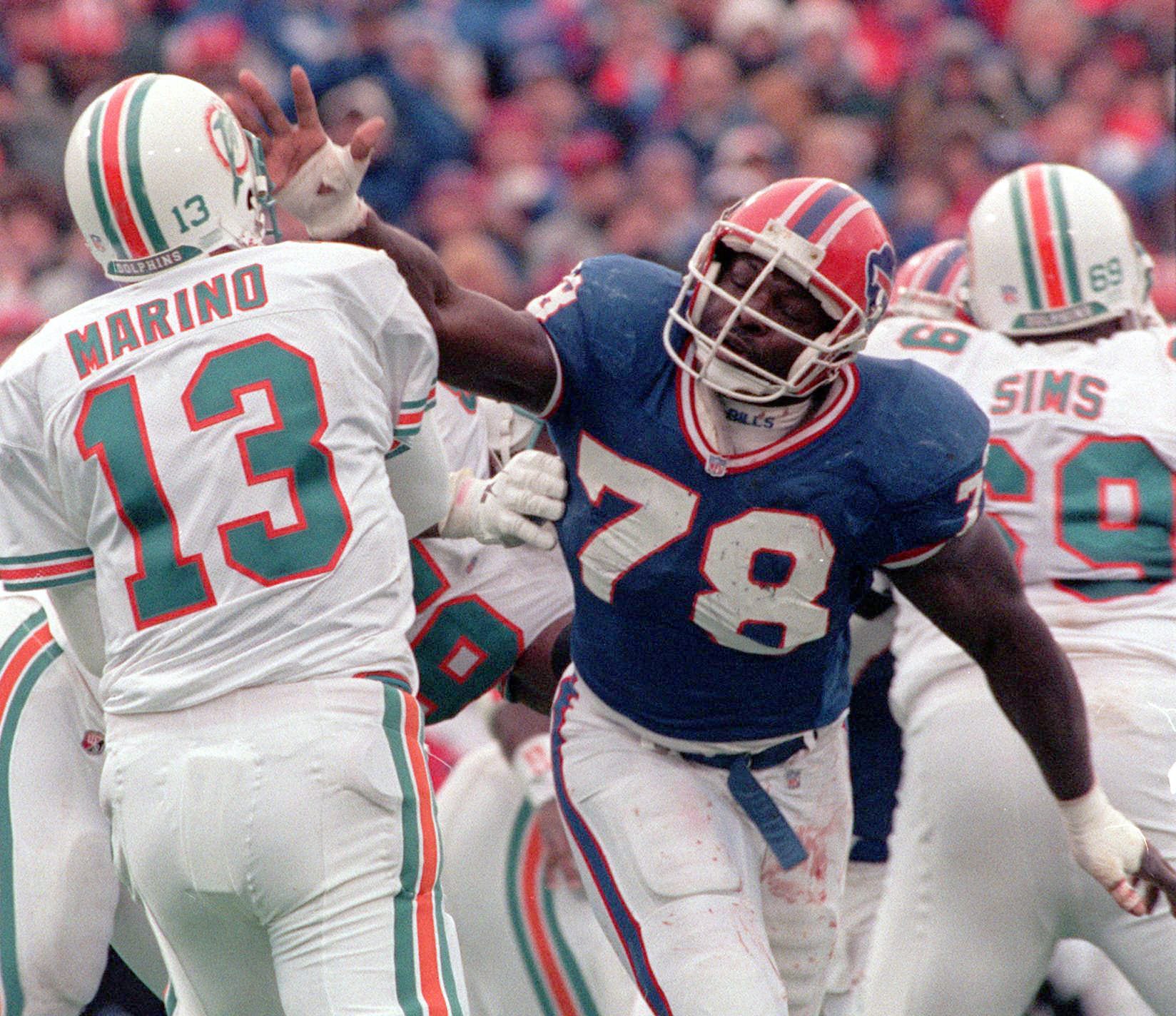 Buffalo Bills’ Bruce Smith pressures Miami Dolphins quarterback Dan Marino during the fourth quarter in 1995.