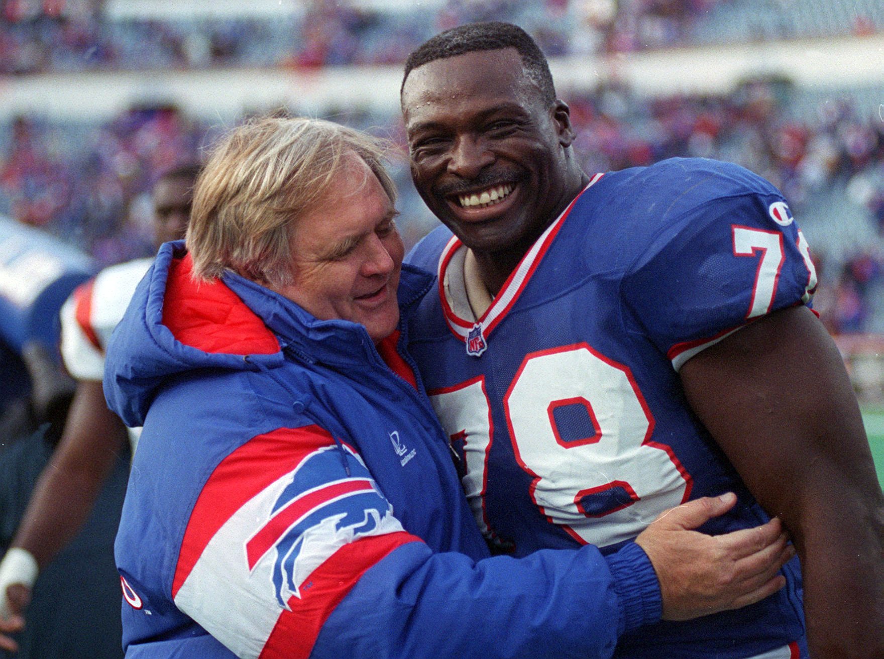 Buffalo Bills defensive end Bruce Smith is hugged by defensive coordinator Wade Phillips after a win over the Cincinnati Bengals in 1996. The sack moved Smith into second place on the NFL’s all-time sacks list.