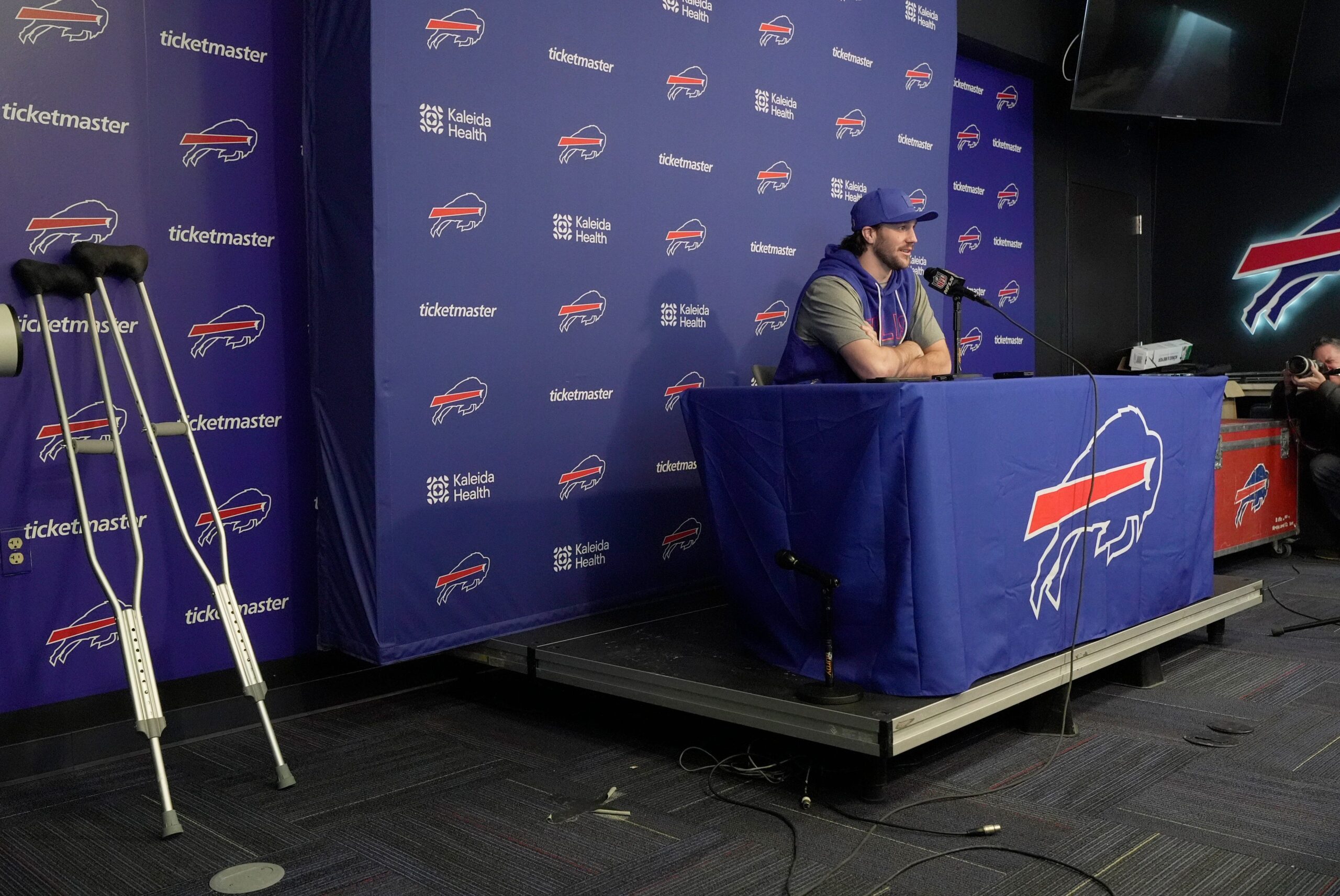 Bills quarterback Josh Allen answers a range of questions during a press conference at the Bills field house in Orchard Park on Jan. 29, 2026. He had minor surgery on his foot recently.