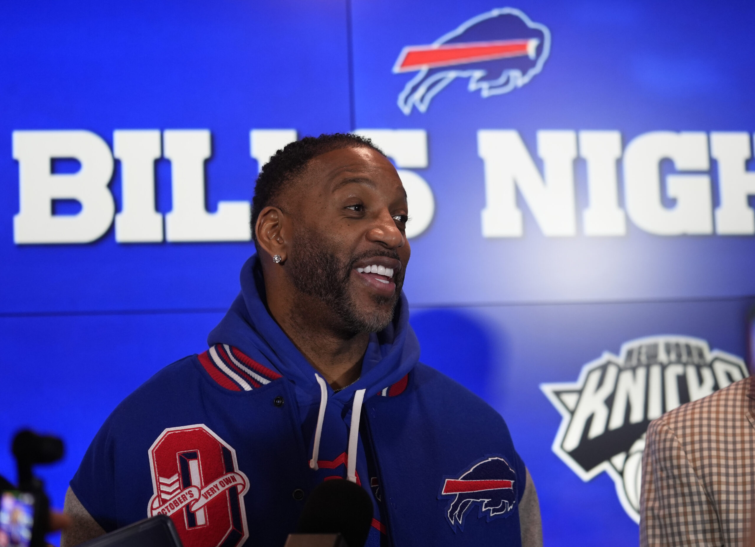 Mar 3, 2026; Toronto, Ontario, CAN; Former Toronto Raptors and Buffalo Bills minority owner Tracy McGrady talks to the media before a game between the New York Knicks and Toronto Raptors the at Scotiabank Arena. Mandatory Credit: John E. Sokolowski-Imagn Images