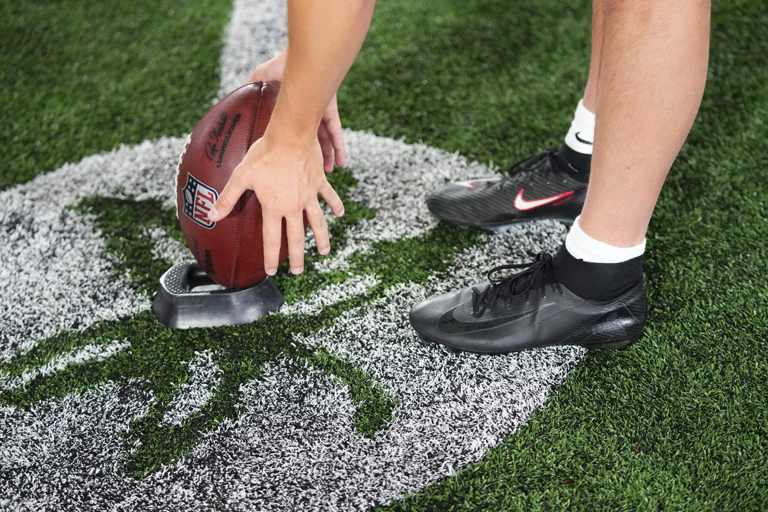 Ohio State Buckeyes kicker Jayden Fielding places a ball on the tee for a kickoff during Pro Day for NFL scouts at the Woody Hayes Athletics Center on March 25, 2026.
