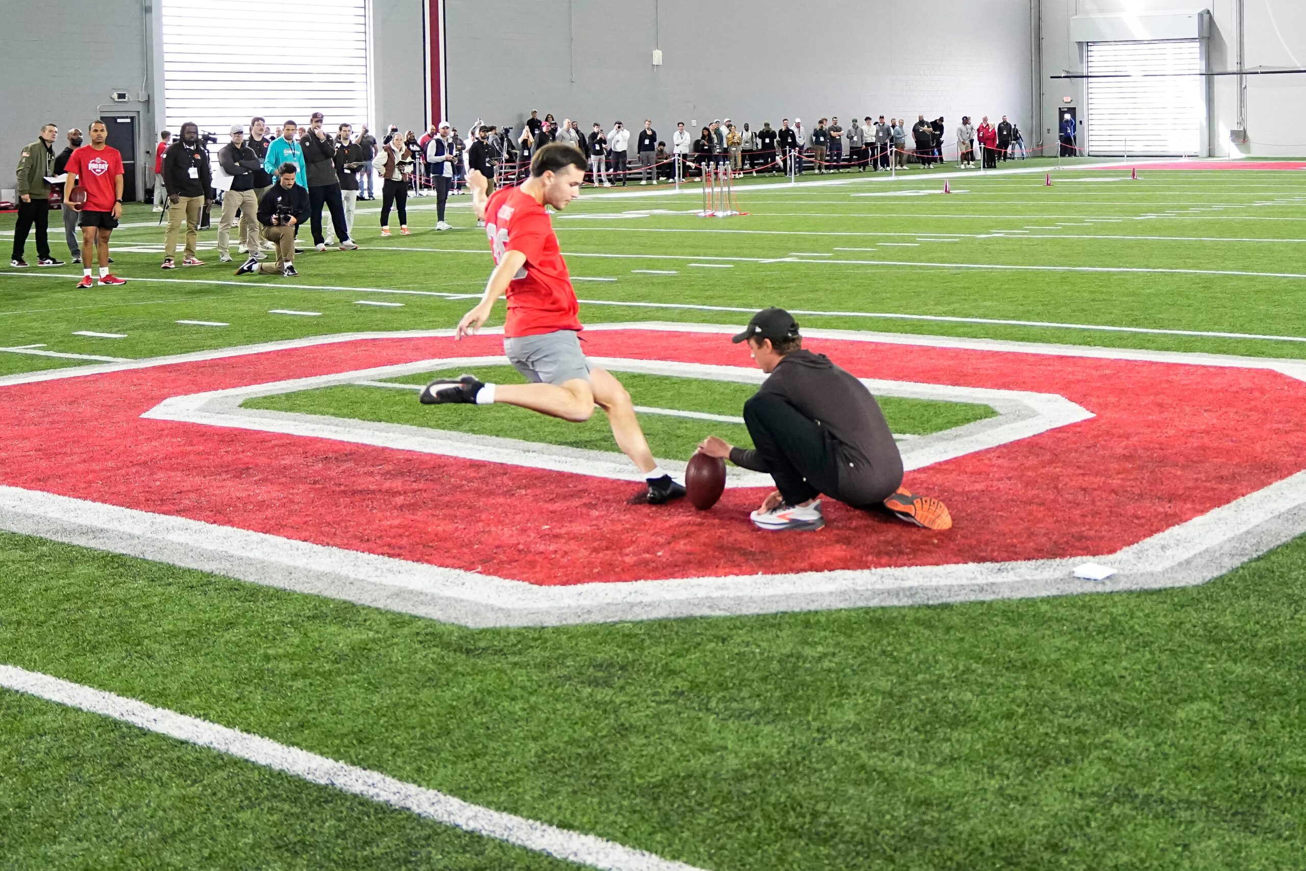 Ohio State Buckeyes kicker Jayden Fielding kicks field goals during Pro Day for NFL scouts at the Woody Hayes Athletics Center on March 25, 2026.