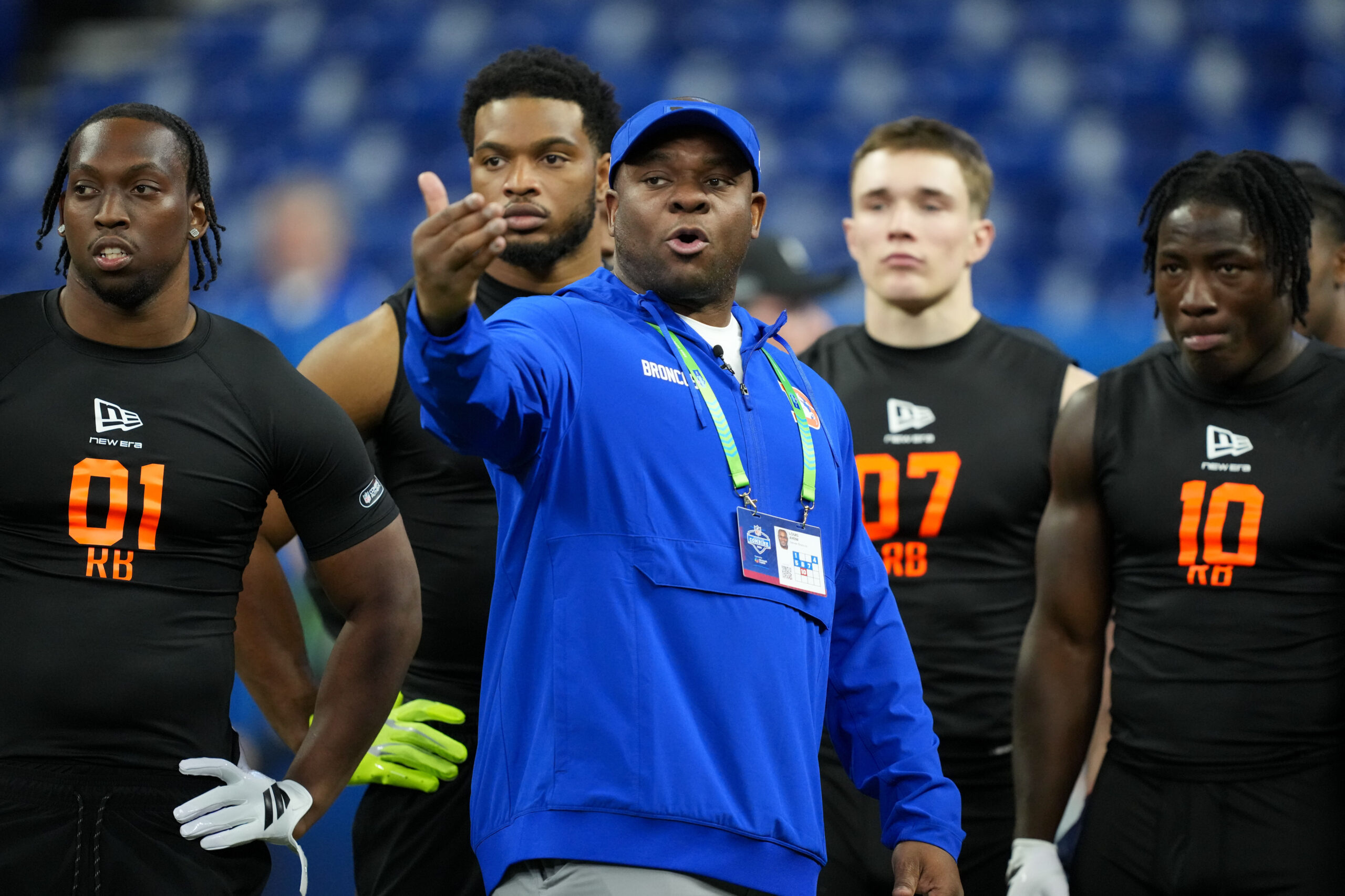 Feb 28, 2026; Indianapolis, IN, USA; Denver Broncos running backs coach Lou Ayeni speaks to the participants during the NFL Scouting Combine at Lucas Oil Stadium. Mandatory Credit: Kirby Lee-Imagn Images
