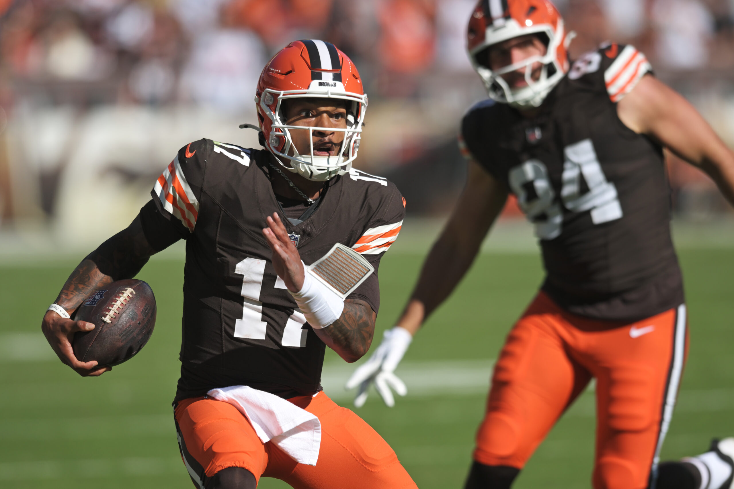 Oct 20, 2024; Cleveland, Ohio, USA; Cleveland Browns quarterback Dorian Thompson-Robinson (17) runs with the ball during the second half against the Cincinnati Bengals at Huntington Bank Field. Mandatory Credit: Ken Blaze-Imagn Images