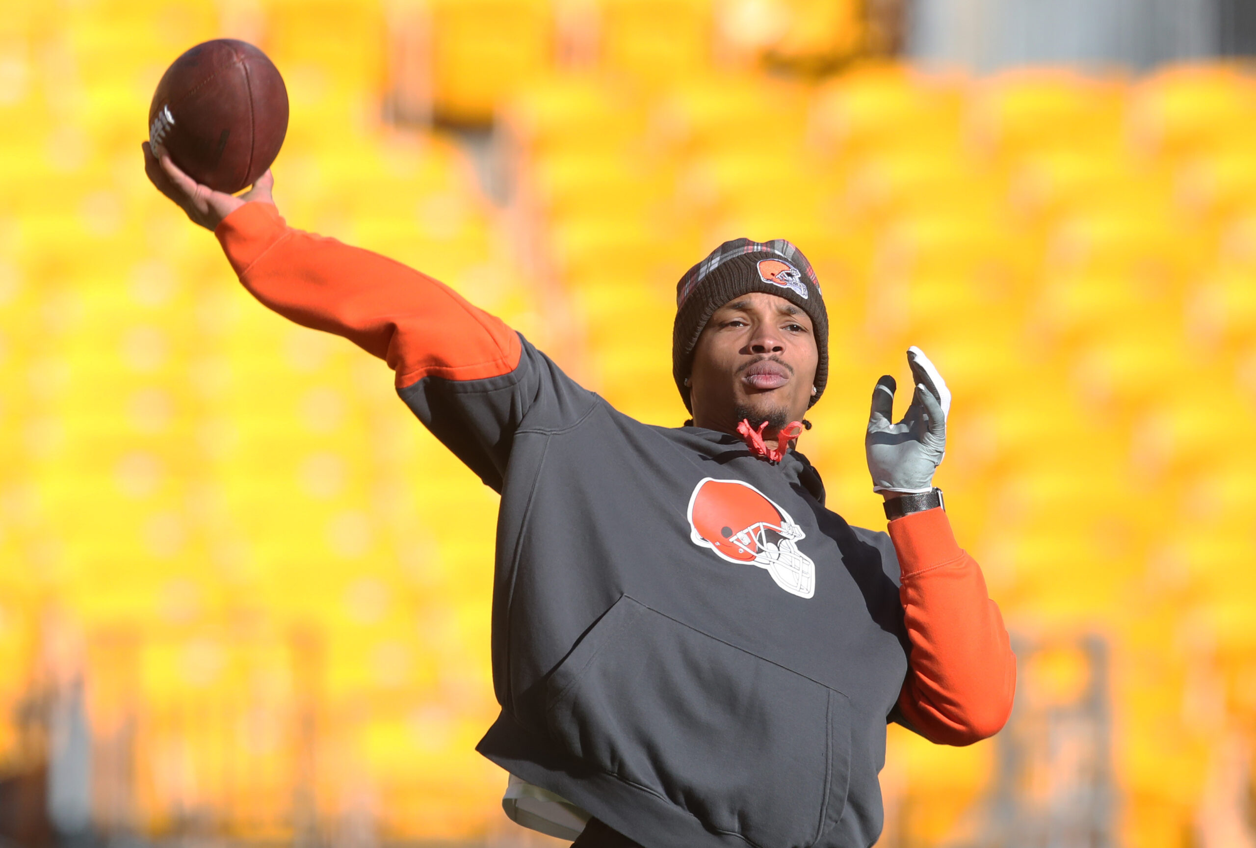Dec 8, 2024; Pittsburgh, Pennsylvania, USA; Cleveland Browns quarterback Dorian Thompson-Robinson (17) warms up before the game against the Pittsburgh Steelers at PPG Paints Arena. Mandatory Credit: Charles LeClaire-Imagn Images