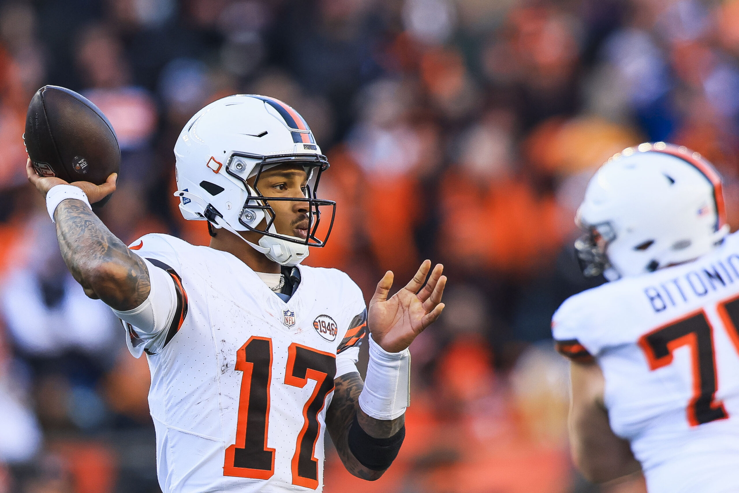 Dec 22, 2024; Cincinnati, Ohio, USA; Cleveland Browns quarterback Dorian Thompson-Robinson (17) throws a pass against the Cincinnati Bengals in the second half at Paycor Stadium. Mandatory Credit: Katie Stratman-Imagn Images
