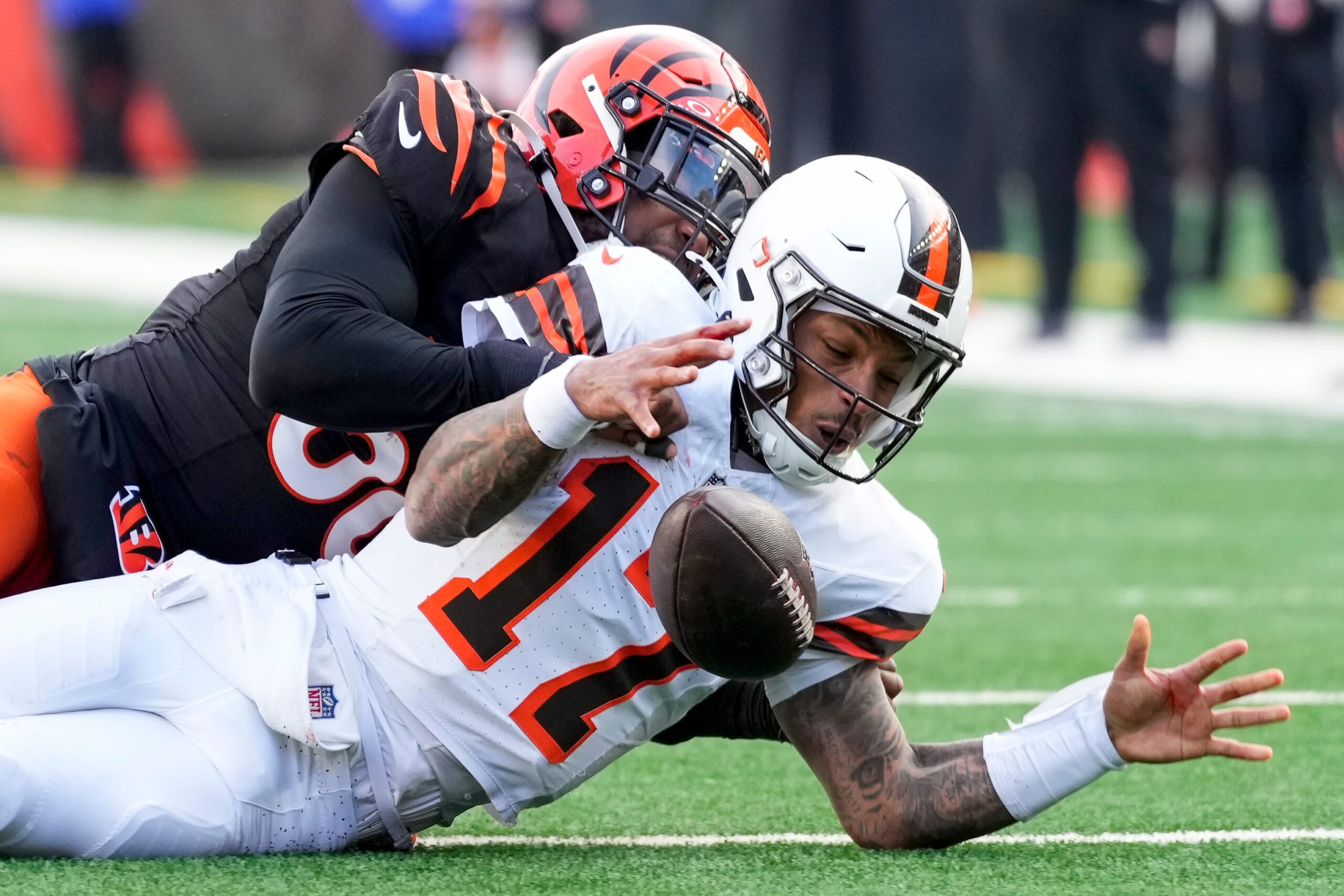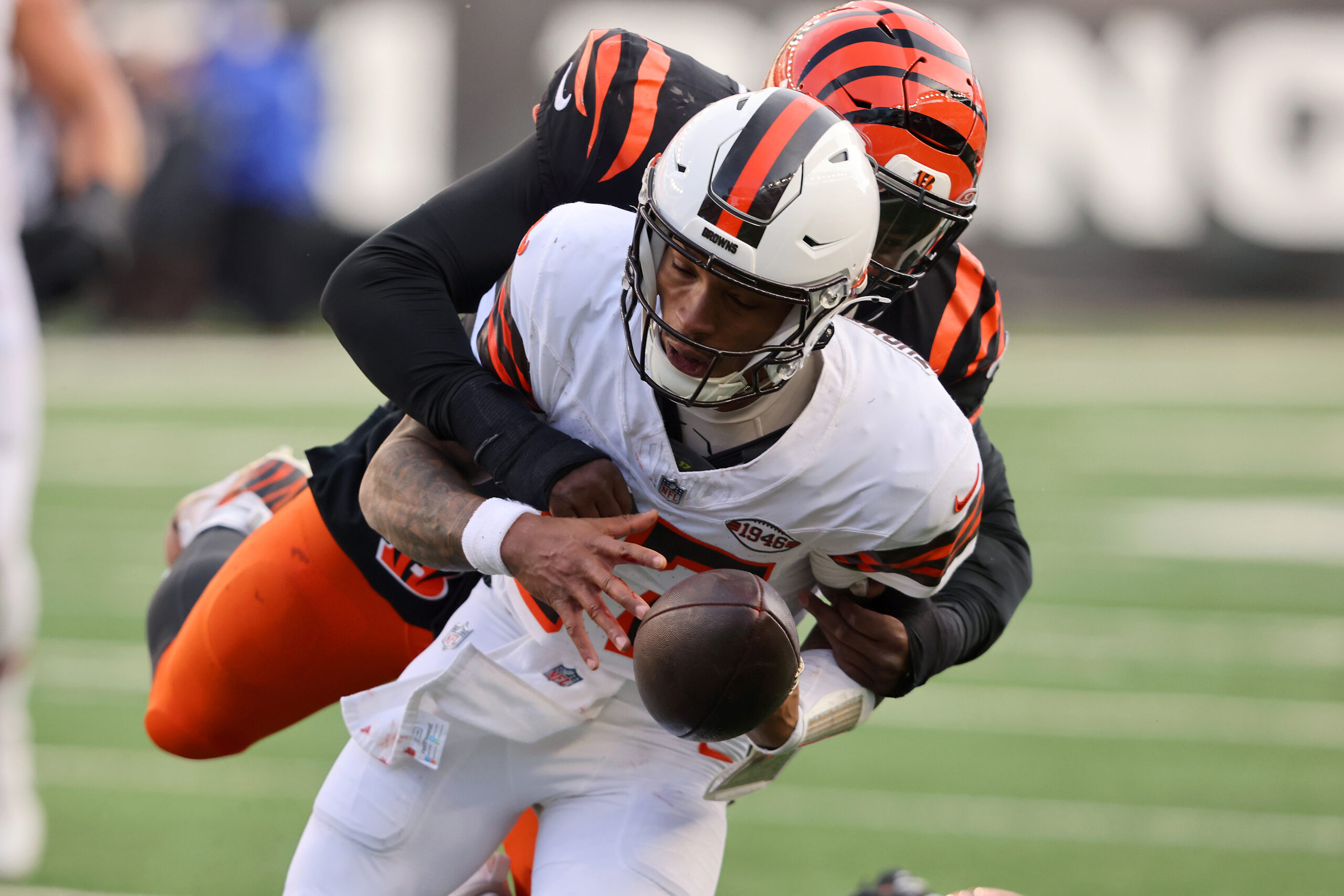 Dec 22, 2024; Cincinnati, Ohio, USA; Cleveland Browns quarterback Dorian Thompson-Robinson (17) fumbles as Cincinnati Bengals defensive end Joseph Ossai (58) makes the tackle during the fourth quarter at Paycor Stadium. Mandatory Credit: Joseph Maiorana-Imagn Images