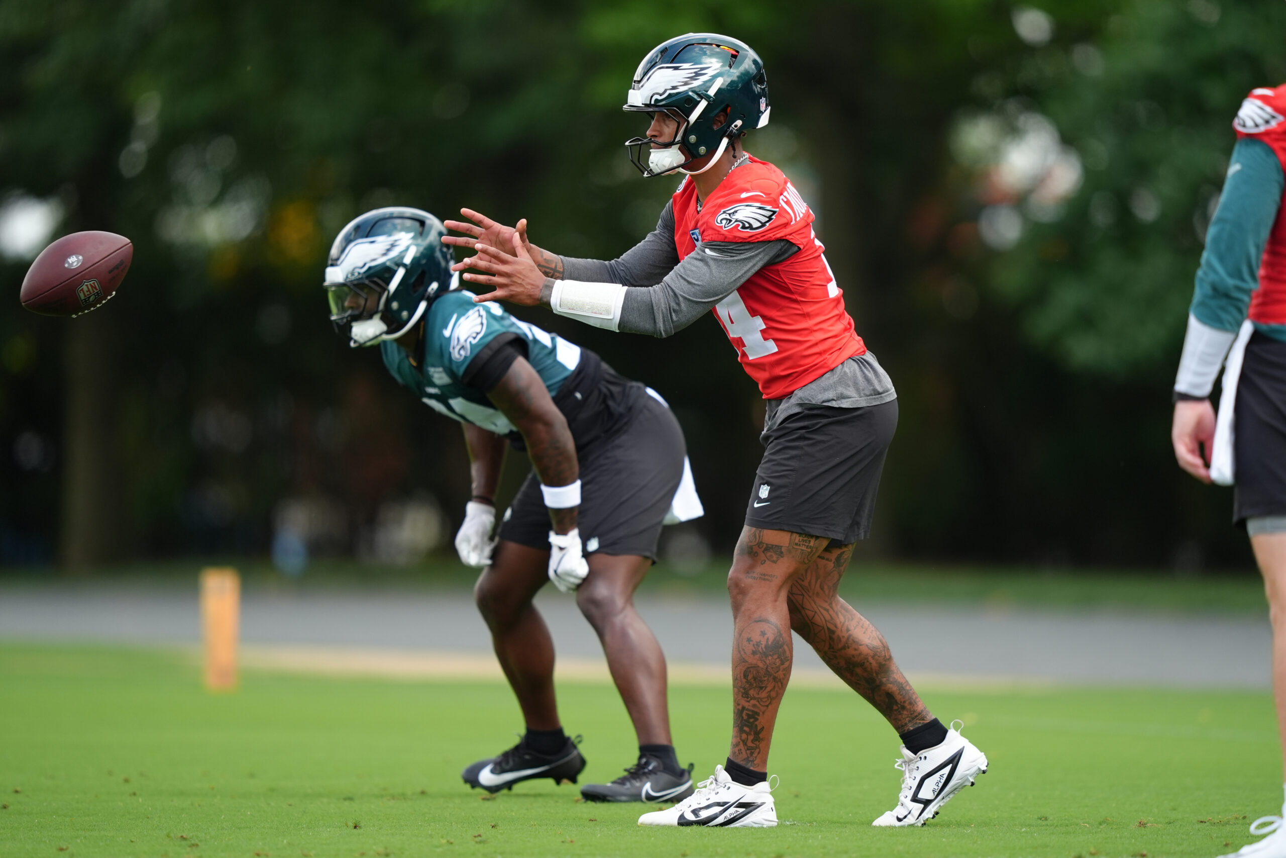 Jun 10, 2025; Philadelphia, PA, USA; Philadelphia Eagles quarterback Dorian Thompson-Robinson (14) performs a practice drill at NovaCare Complex. Mandatory Credit: Kyle Ross-Imagn Images