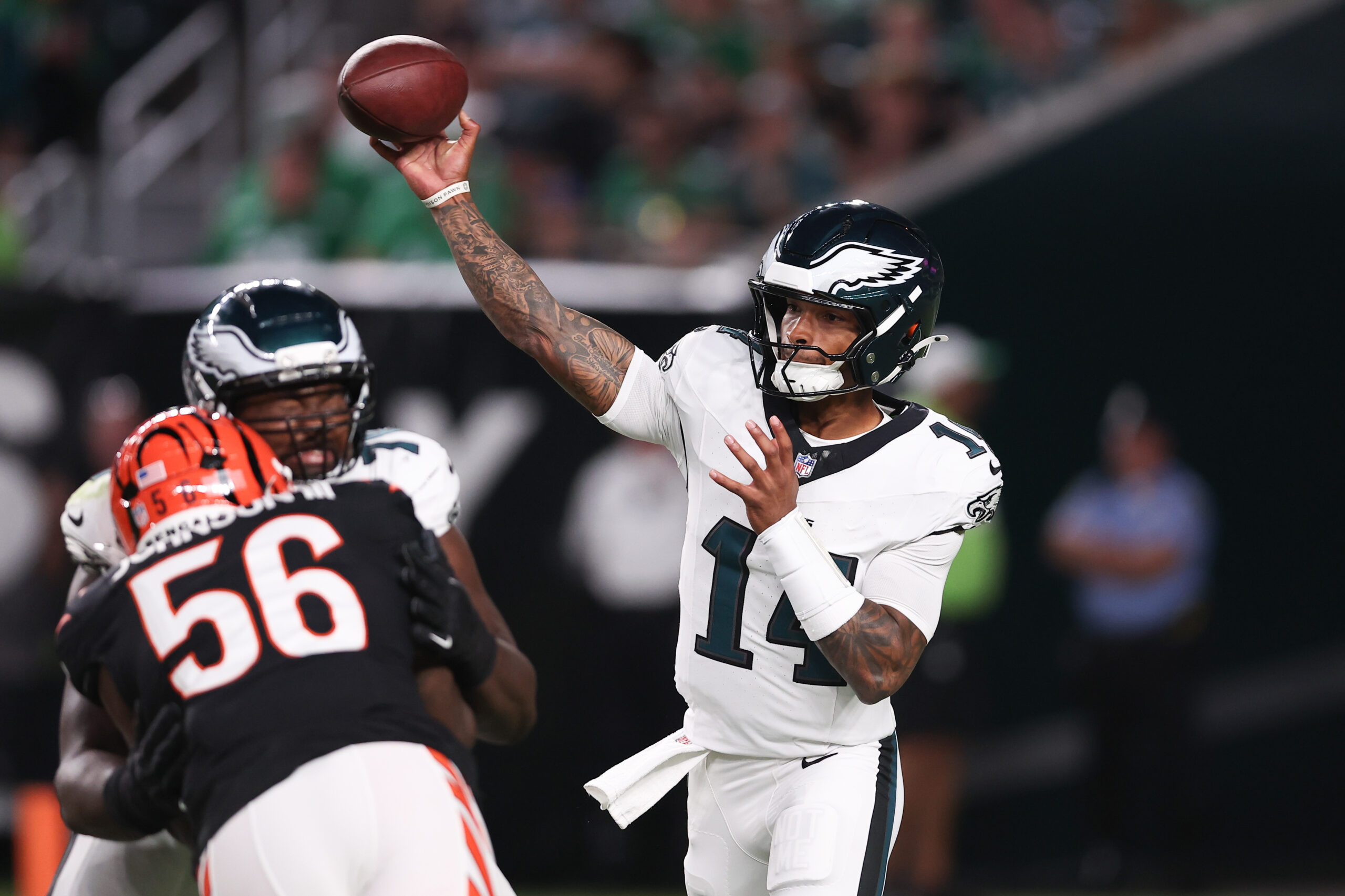Aug 7, 2025; Philadelphia, Pennsylvania, USA; Philadelphia Eagles quarterback Dorian Thompson-Robinson (14) passes the ball against the Cincinnati Bengals during the third quarter at Lincoln Financial Field. Mandatory Credit: Bill Streicher-Imagn Images