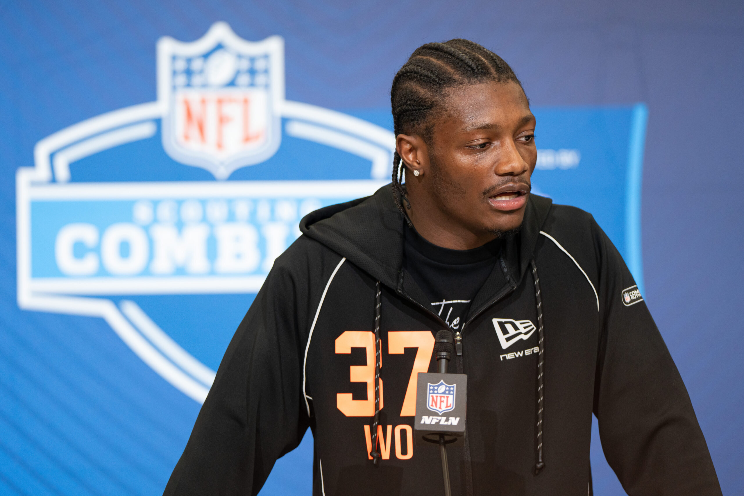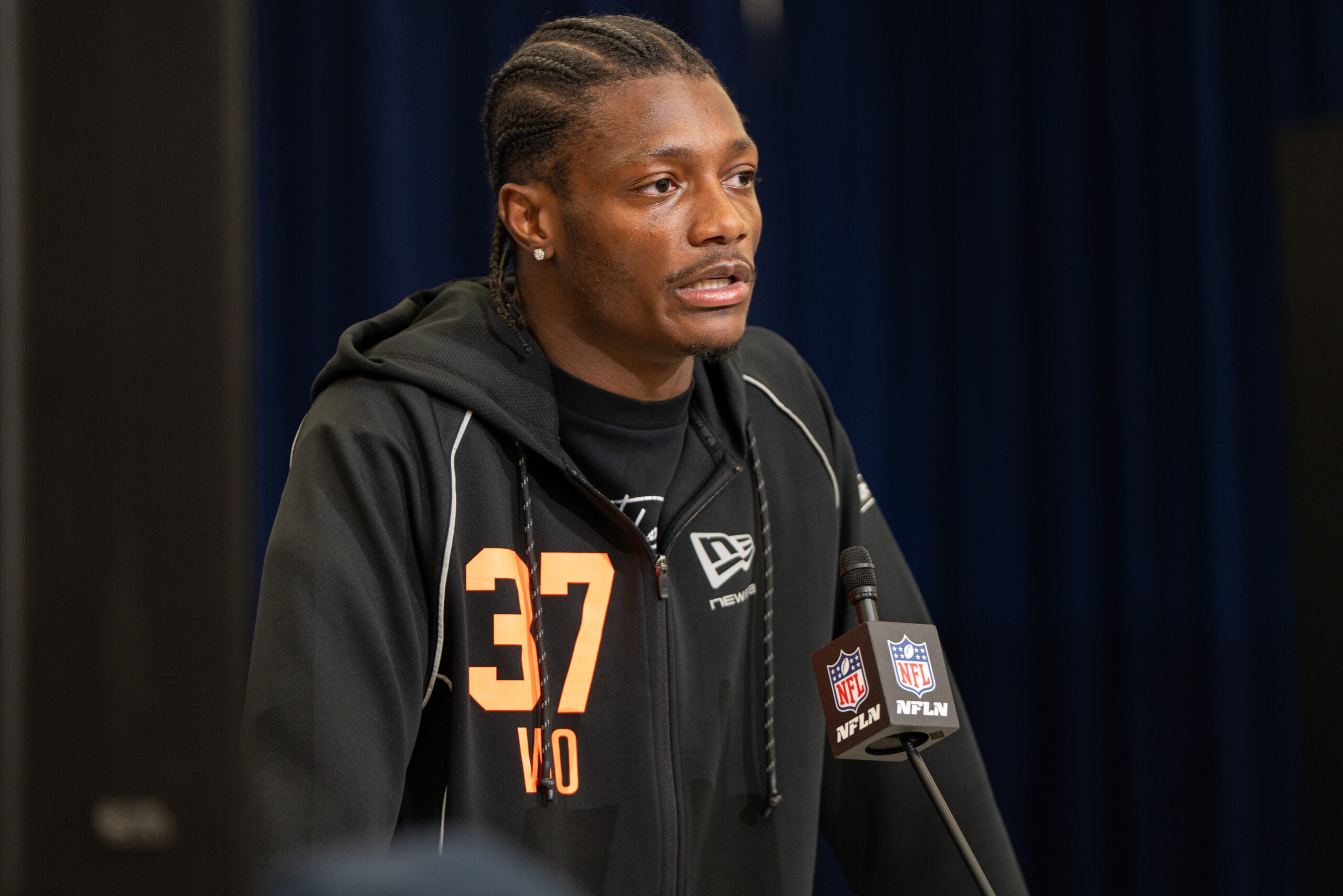 Feb 27, 2026; Indianapolis, IN, USA; Ohio State wideout Carnell Tate (WO37) speaks to members of the media during the NFL Combine at the Indiana Convention Center. Mandatory Credit: Jacob Musselman-Imagn Images