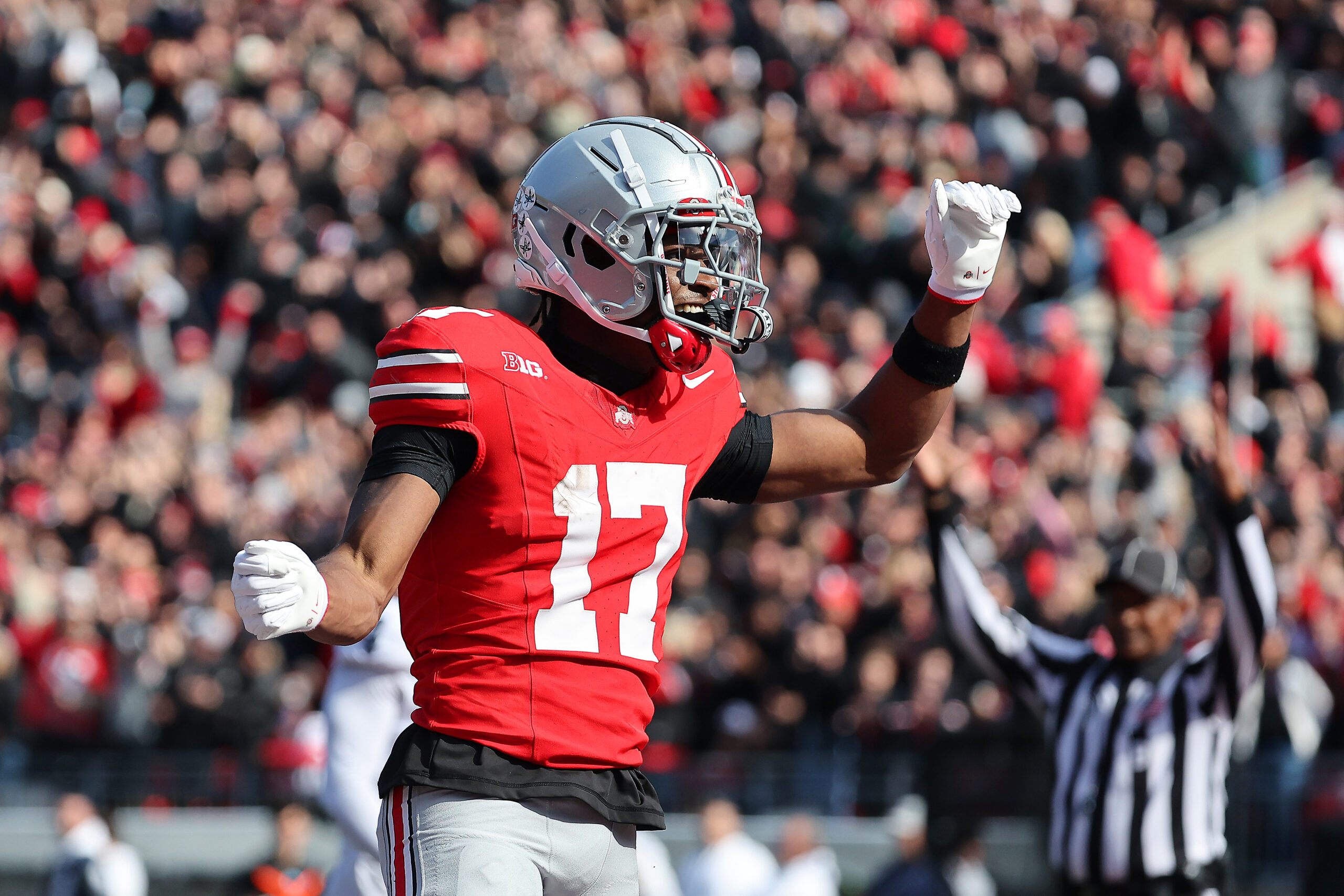 Nov 1, 2025; Columbus, Ohio, USA; Ohio State Buckeyes wide receiver Carnell Tate (17) celebrates his touchdown during the second quarter against the Penn State Nittany Lions at Ohio Stadium. Mandatory Credit: Joseph Maiorana-Imagn Images
