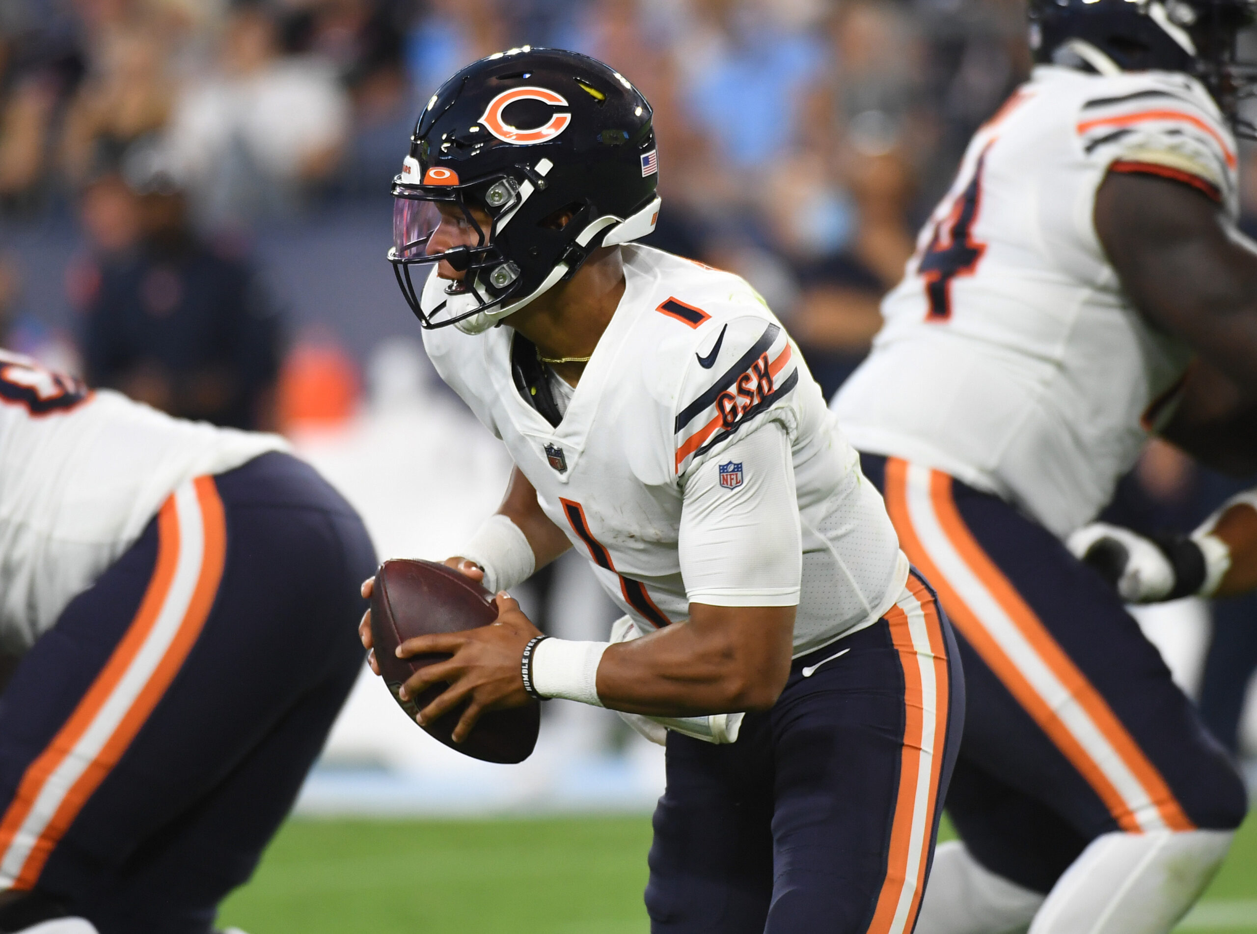 Aug 28, 2021; Nashville, TN, USA; Chicago Bears quarterback Justin Fields (1) during the first half against the Tennessee Titans at Nissan Stadium. Mandatory Credit: Christopher Hanewinckel-Imagn Images
