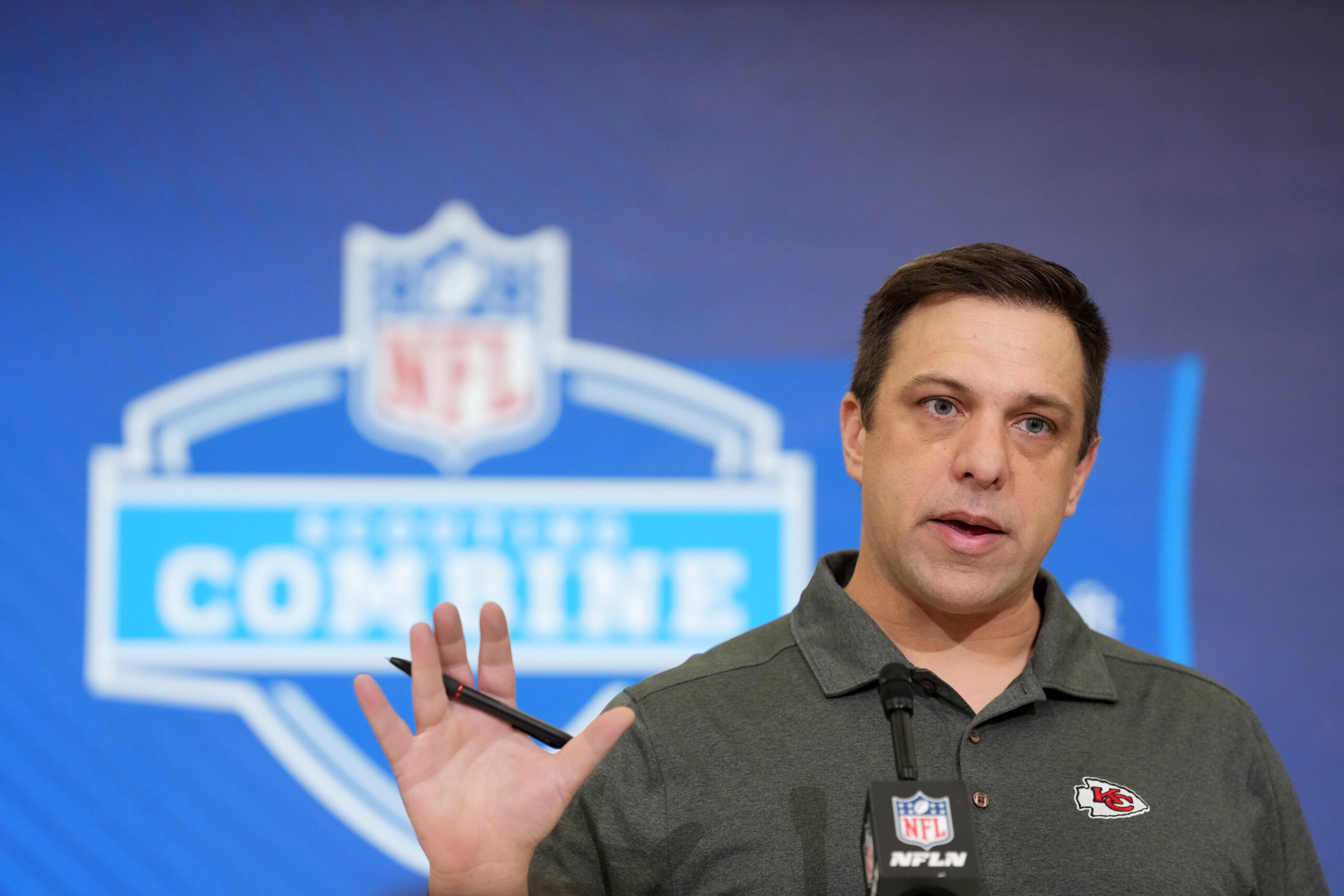 Feb 24, 2026; Indianapolis, IN, USA; Kansas City Chiefs general manager Brett Veach speaks at the NFL Scouting Combine at the Indiana Convention Center. Mandatory Credit: Kirby Lee-Imagn Images