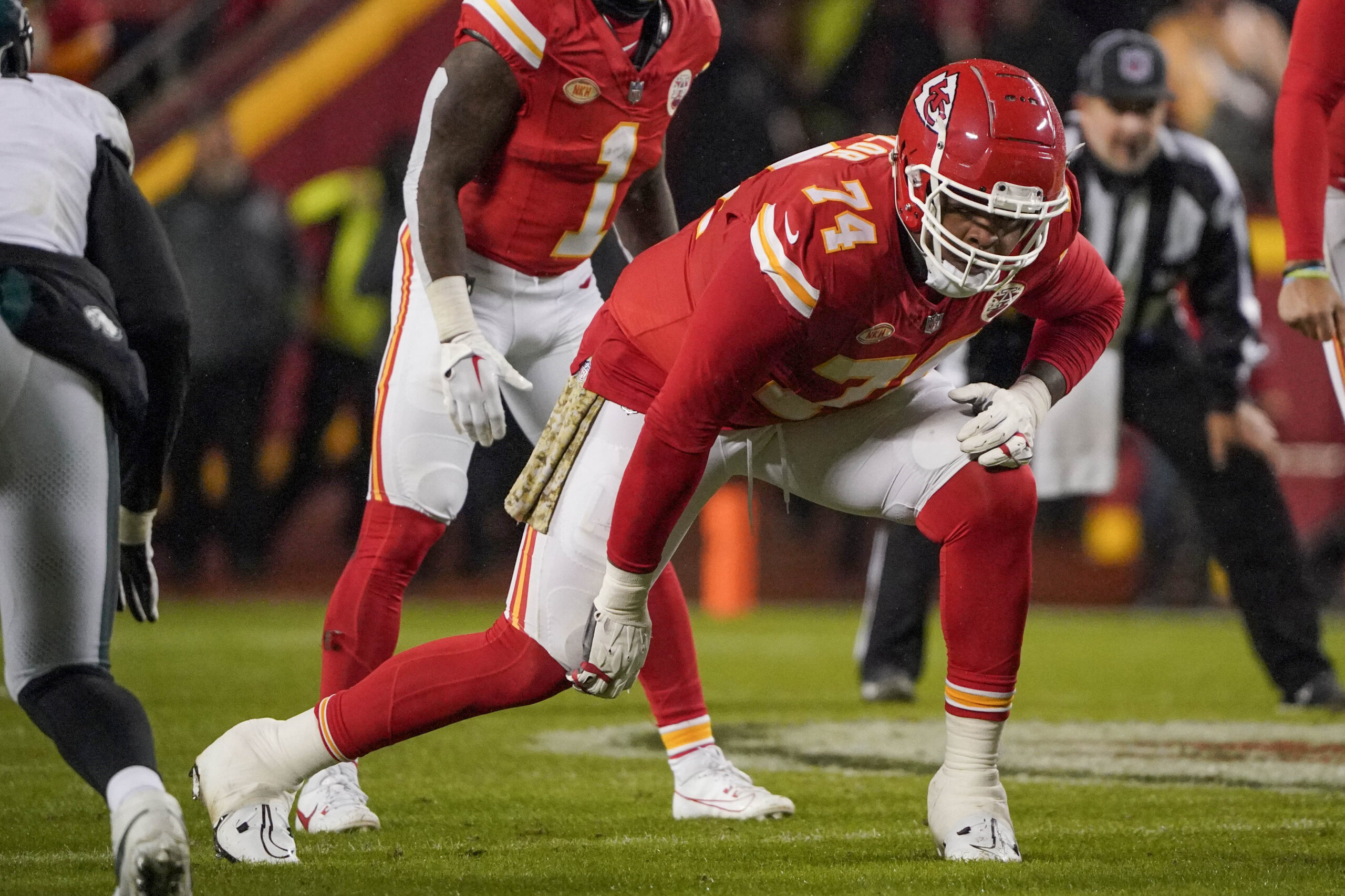 Nov 20, 2023; Kansas City, Missouri, USA; Kansas City Chiefs offensive tackle Jawaan Taylor (74) on the line of scrimmage against the Philadelphia Eagles during the game at GEHA Field at Arrowhead Stadium. Mandatory Credit: Denny Medley-Imagn Images