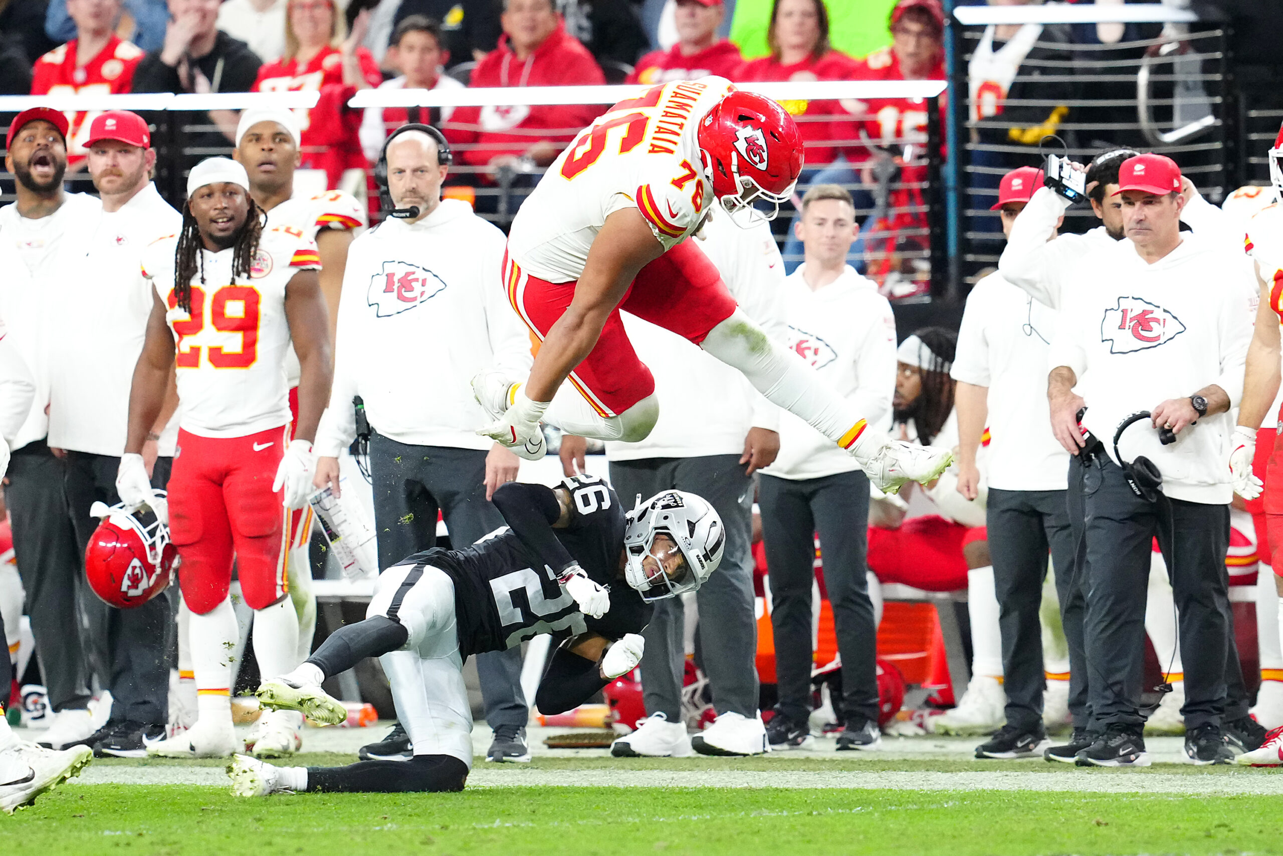 Jan 4, 2026; Paradise, Nevada, USA; Kansas City Chiefs guard Kingsley Suamataia (76) hurdles Las Vegas Raiders cornerback Darien Porter (26) as he goes out of bounds on the final play of the fourth quarter at Allegiant Stadium. Mandatory Credit: Stephen R. Sylvanie-Imagn Images