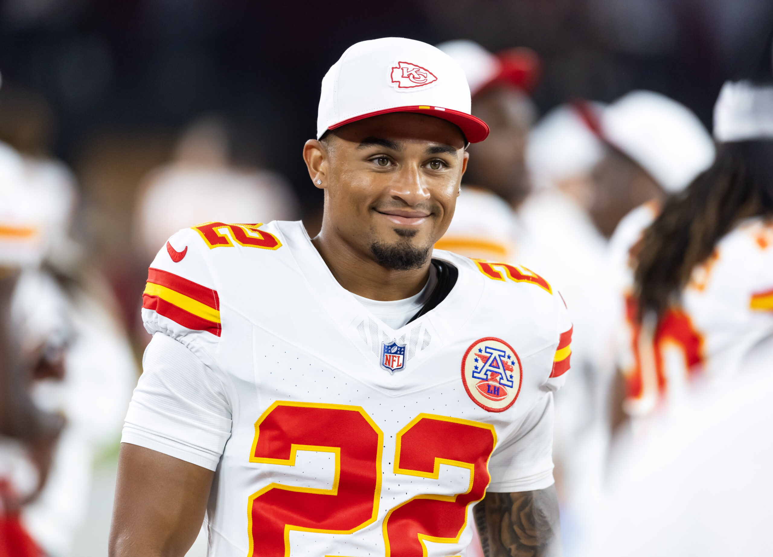 Aug 9, 2025; Glendale, Arizona, USA; Kansas City Chiefs cornerback Trent McDuffie (22) against the Arizona Cardinals during a preseason NFL game at State Farm Stadium. Mandatory Credit: Mark J. Rebilas-Imagn Images