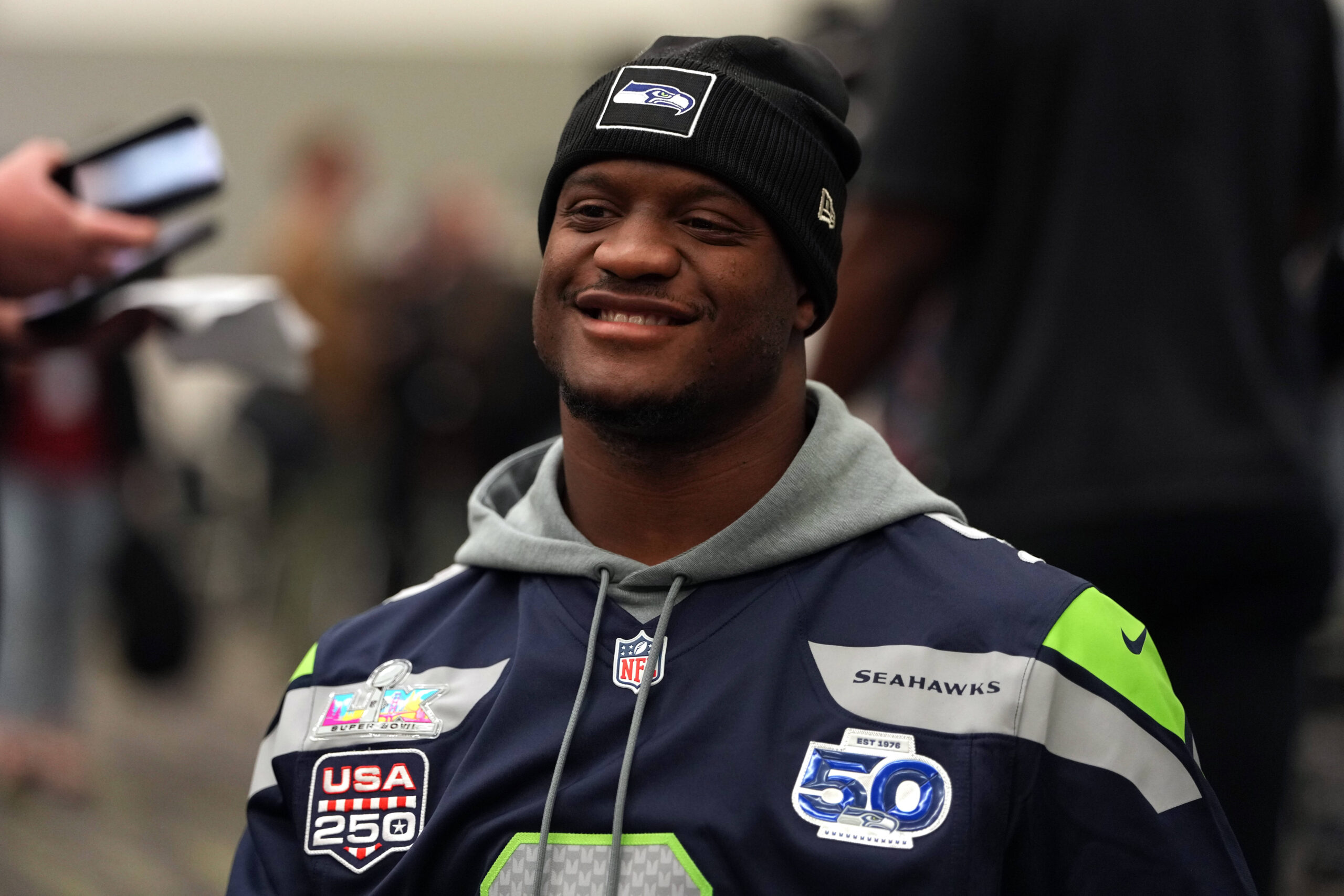 Feb 5, 2026; San Jose, CA, USA; Seattle Seahawks running back Kenneth Walker III (9) talks to media members at the San Jose Marriott. Mandatory Credit: Darren Yamashita-Imagn Images