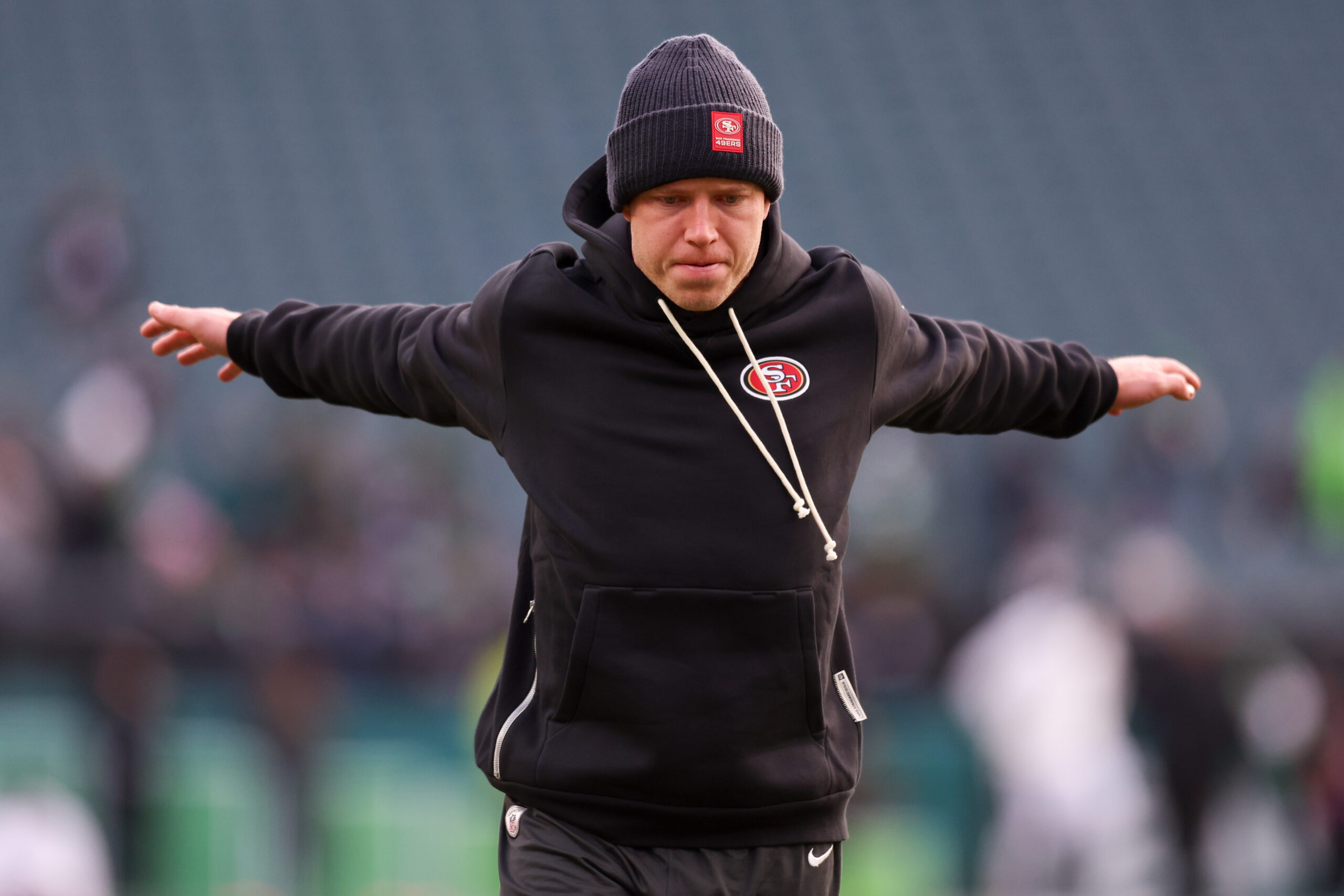 Jan 11, 2026; Philadelphia, PA, USA; San Francisco 49ers running back Christian McCaffrey (23) warms up prior to an NFC Wild Card Round game against the Philadelphia Eagles at Lincoln Financial Field. Mandatory Credit: Bill Streicher-Imagn Images