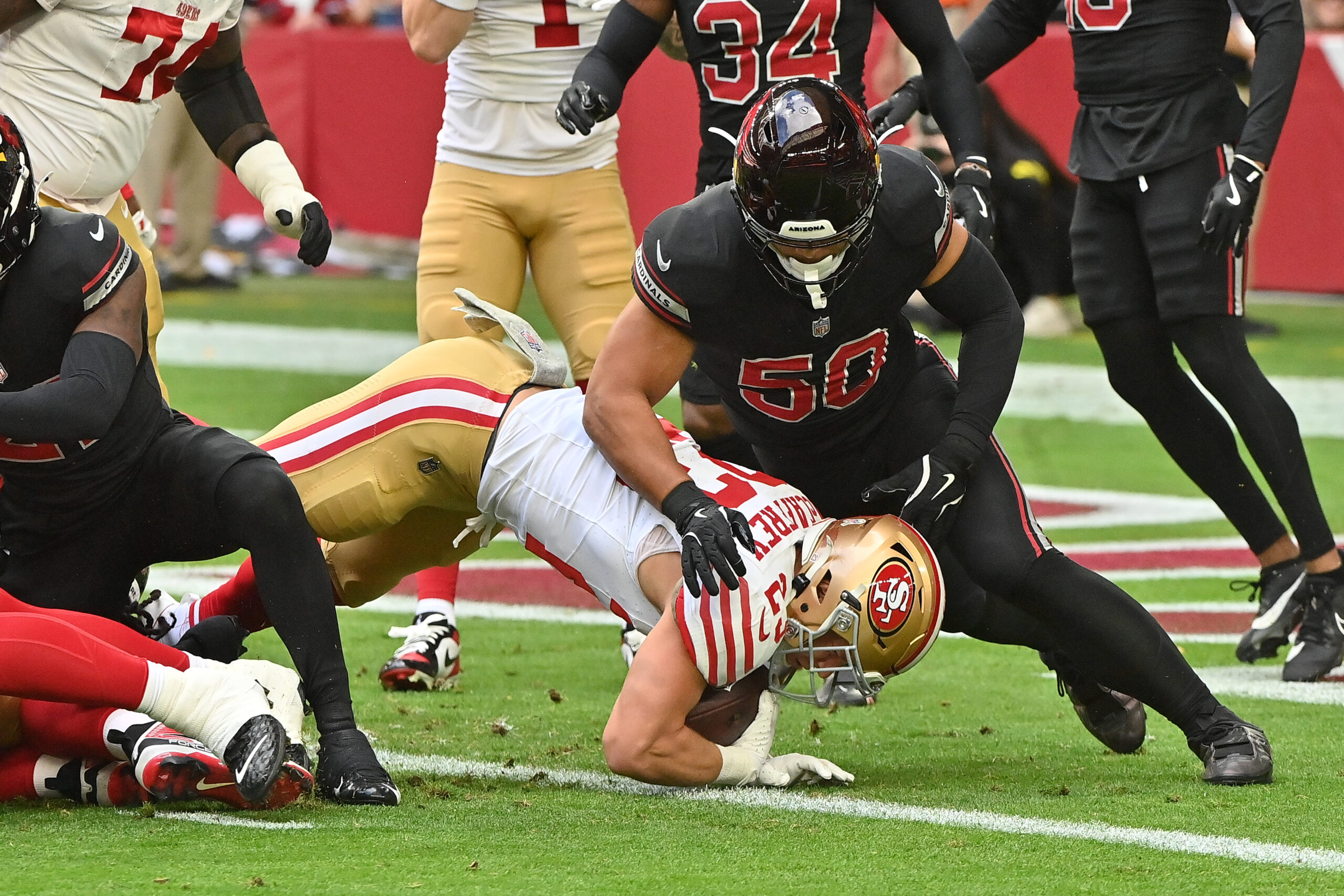 Nov 16, 2025; Glendale, Arizona, USA; San Francisco 49ers running back Christian McCaffrey (23) dives for a touchdown in the first quarter against the Arizona Cardinals at State Farm Stadium. Mandatory Credit: Matt Kartozian-Imagn Images
