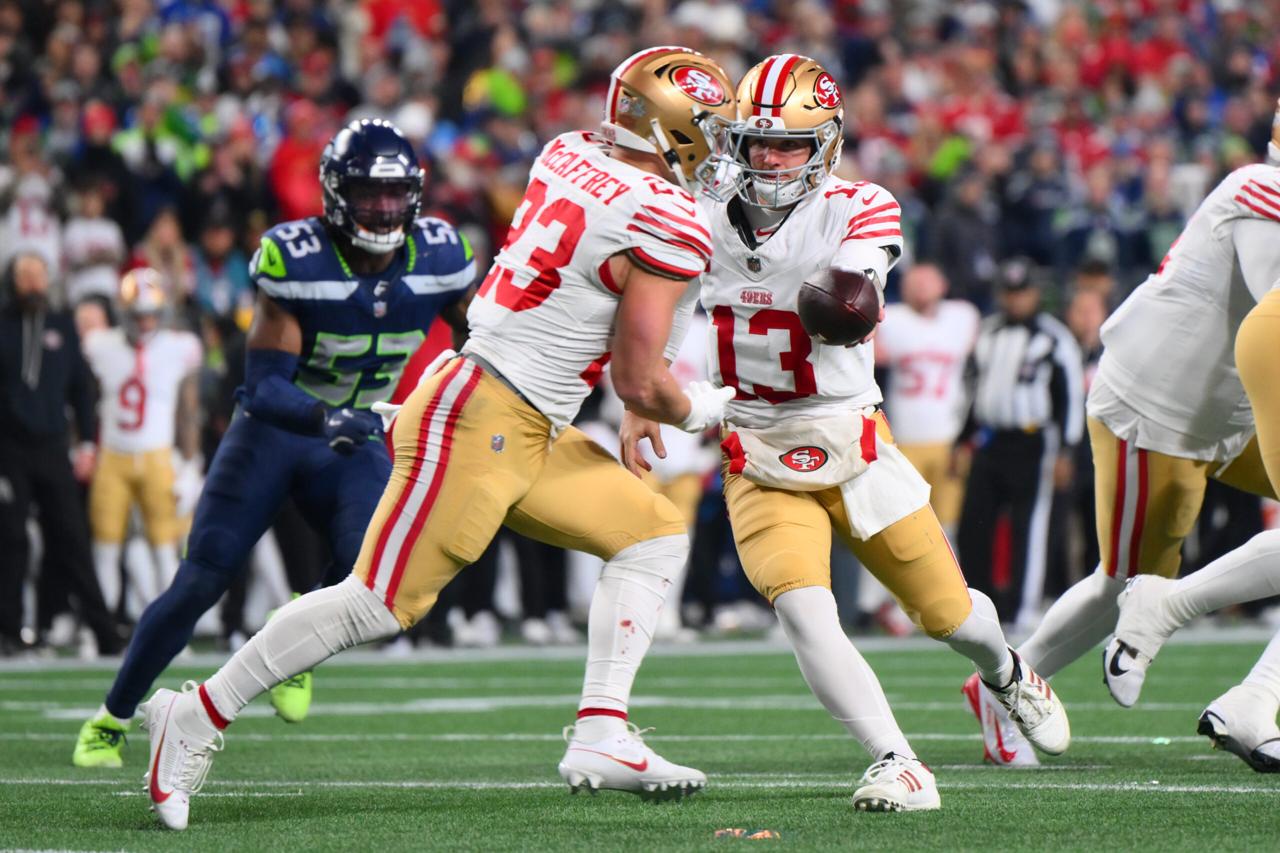 Jan 17, 2026; Seattle, WA, USA; San Francisco 49ers quarterback Brock Purdy (13) hands off to running back Christian McCaffrey (23) against the Seattle Seahawks during the first half in an NFC Divisional Round game at Lumen Field. Mandatory Credit: Steven Bisig-Imagn Images