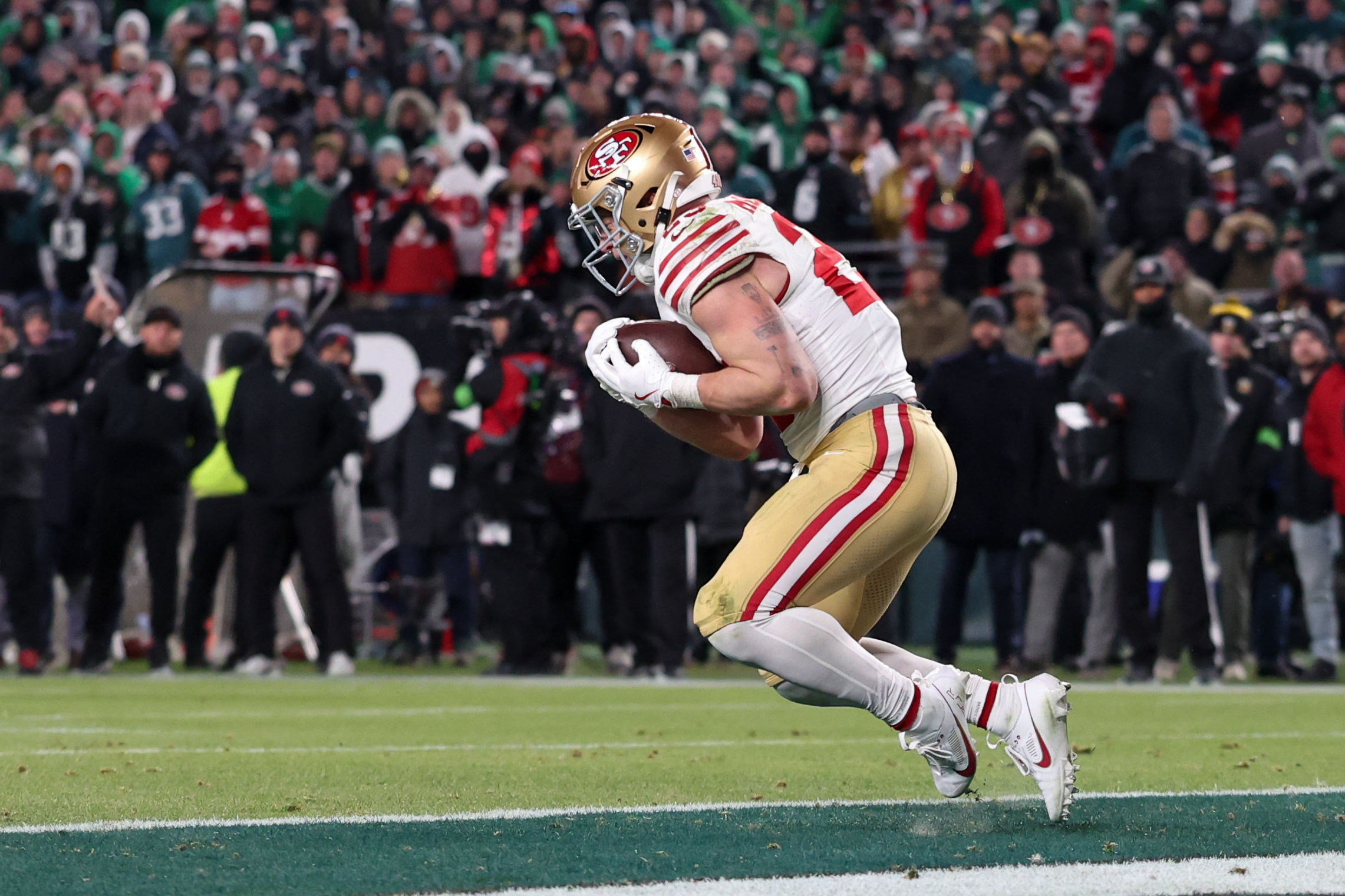 Jan 11, 2026; Philadelphia, PA, USA; San Francisco 49ers running back Christian McCaffrey (23) makes a catch for a touchdown against the Philadelphia Eagles during the fourth quarter in an NFC Wild Card Round game at Lincoln Financial Field. Mandatory Credit: Bill Streicher-Imagn Images
