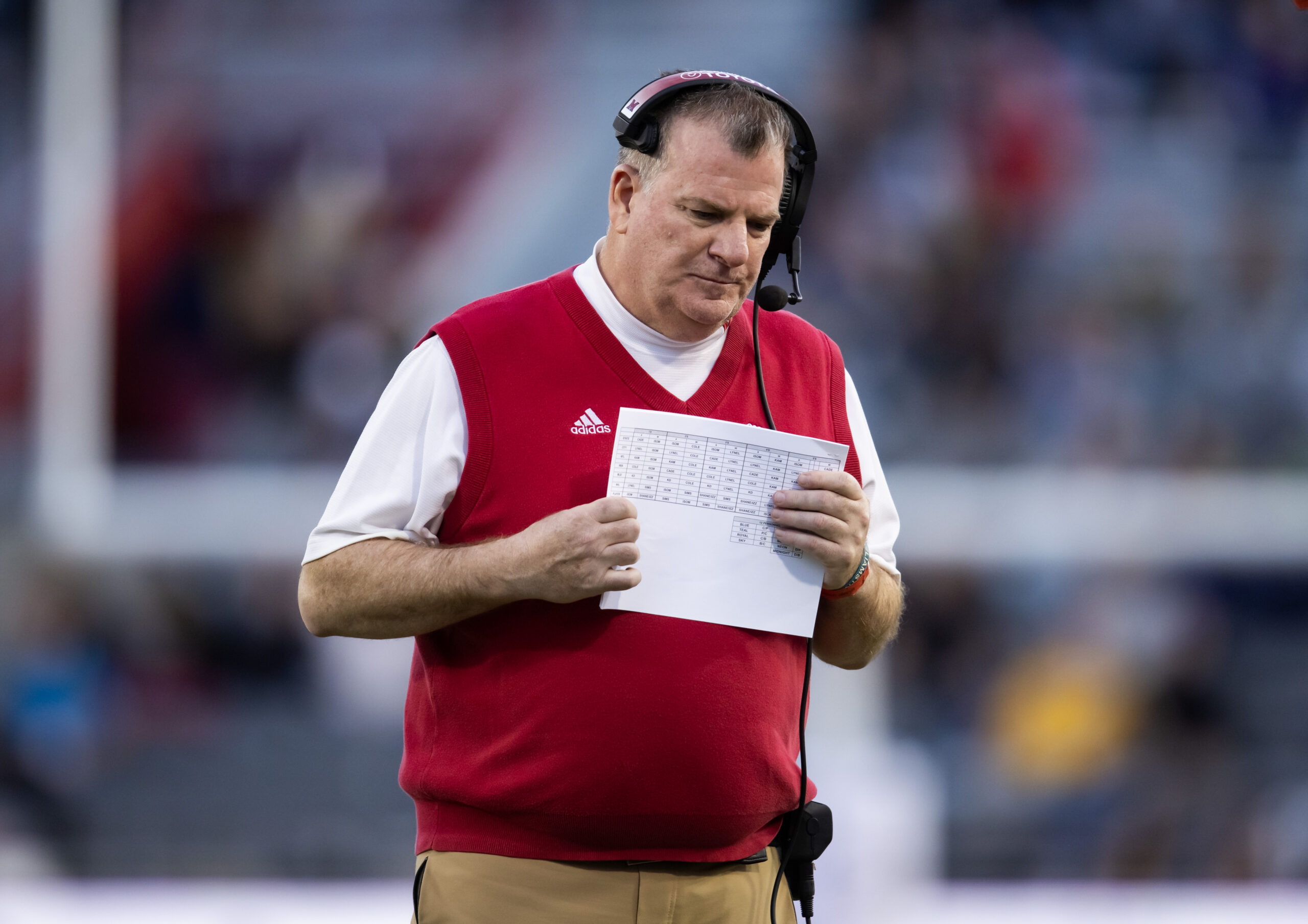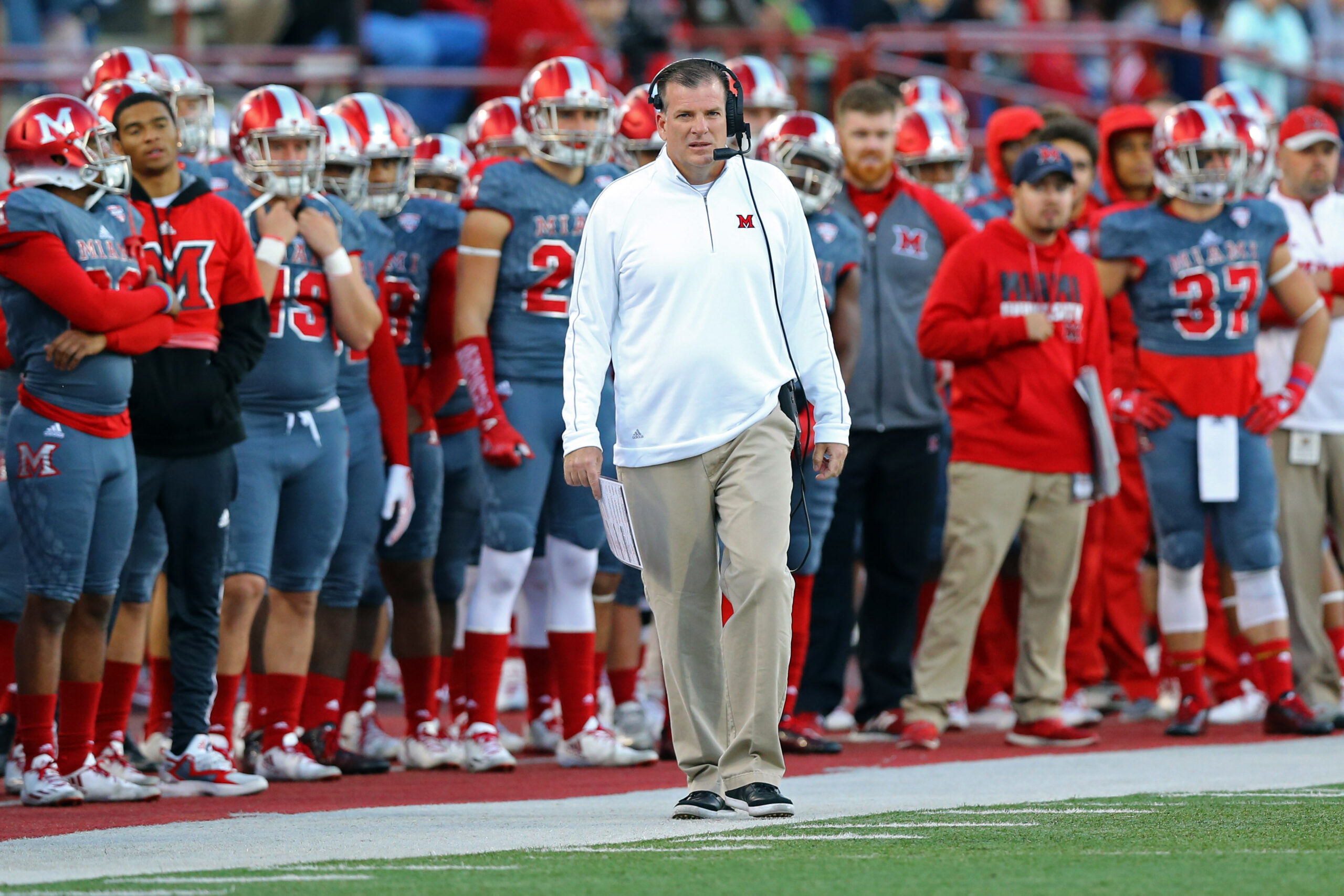 Nov 4, 2016; Oxford, OH, USA; Miami (Oh) Redhawks head coach Chuck Martin looks on from the sidelines against the Central Michigan Chippewas in the first half at Fred Yager Stadium. The Redhawks won 37-17. Mandatory Credit: Aaron Doster-Imagn Images