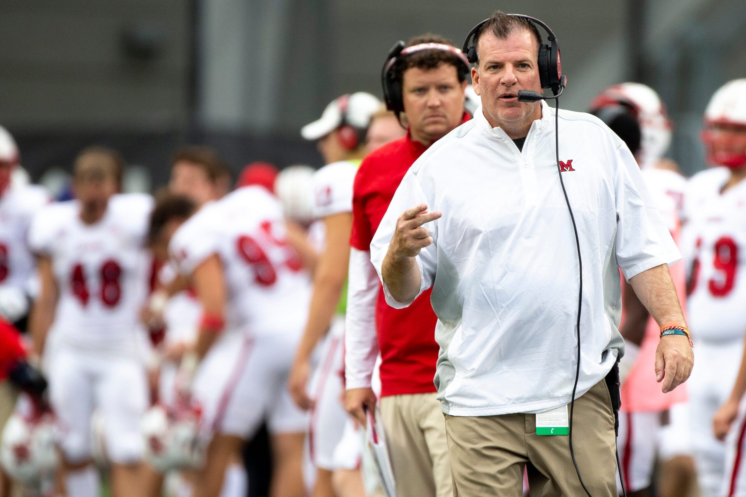 Miami Redhawks head coach Chuck Martin speaks to the referee in the second half of the NCAA football game on Saturday, Sept. 4, 2021, at Nippert Stadium in Cincinnati. Cincinnati Bearcats defeated Miami Redhawks 49-14. Cincinnati Bearcats Miami Redhawks-Imagn Images