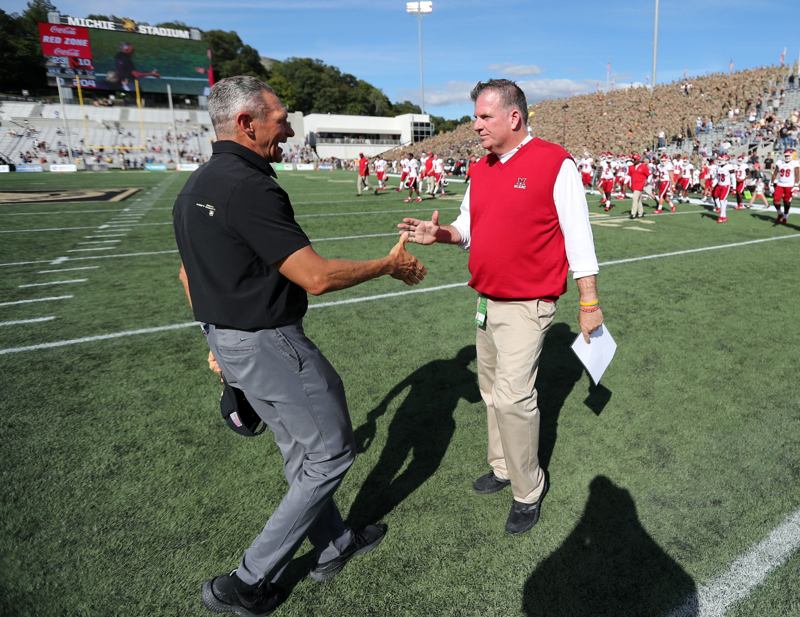 Sep 25, 2021; West Point, New York, USA; Army Black Knights head coach Jeff Monken shakes hands with Miami (Ohio) RedHawks head coach Chuck Martin after Army s 23-10 win at Michie Stadium. Mandatory Credit: Danny Wild-Imagn Images