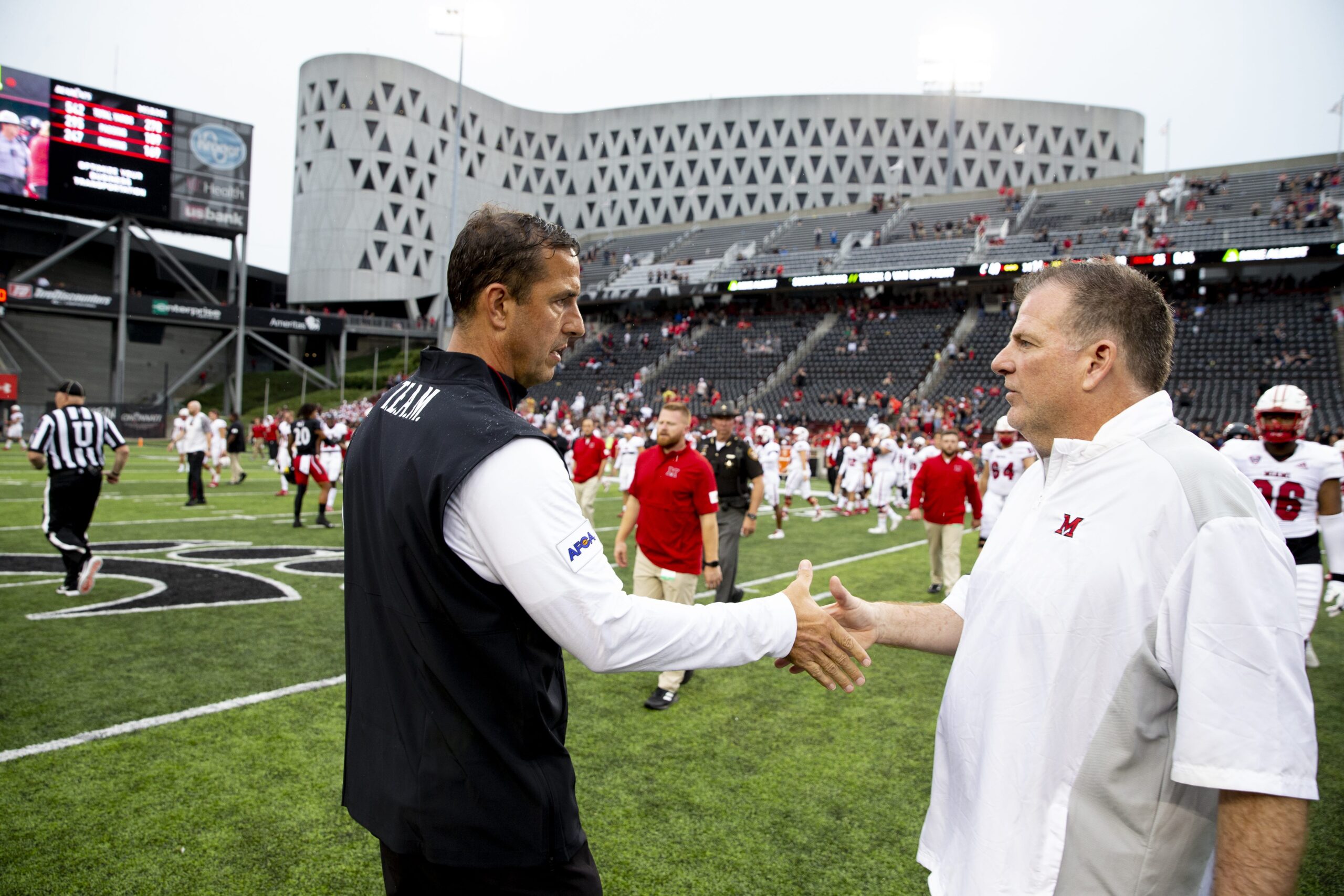 Cincinnati Bearcats head coach Luke Fickell and Miami Redhawks head coach Chuck Martin after the NCAA football game on Saturday, Sept. 4, 2021, at Nippert Stadium in Cincinnati. Cincinnati Bearcats defeated Miami Redhawks 49-14. Cincinnati Bearcats Miami Redhawks-Imagn Images