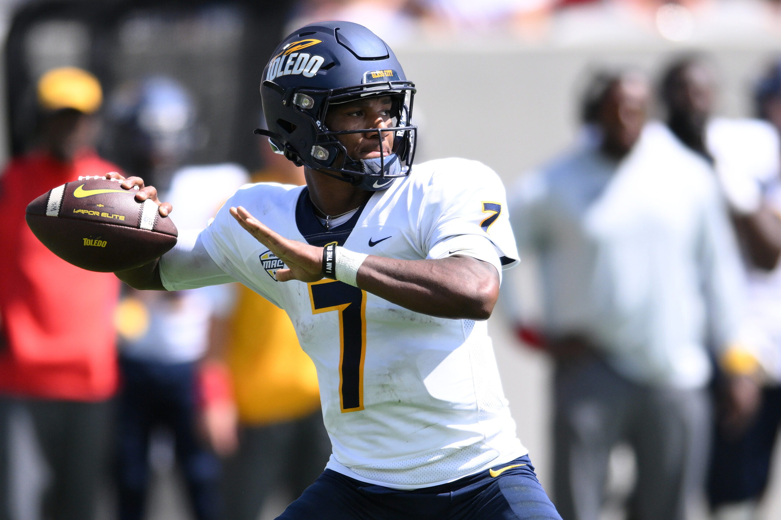 Sep 24, 2022; San Diego, California, USA; Toledo Rockets quarterback Dequan Finn (7) throws a pass against the San Diego State Aztecs during the first half at Snapdragon Stadium. Mandatory Credit: Orlando Ramirez-Imagn Images