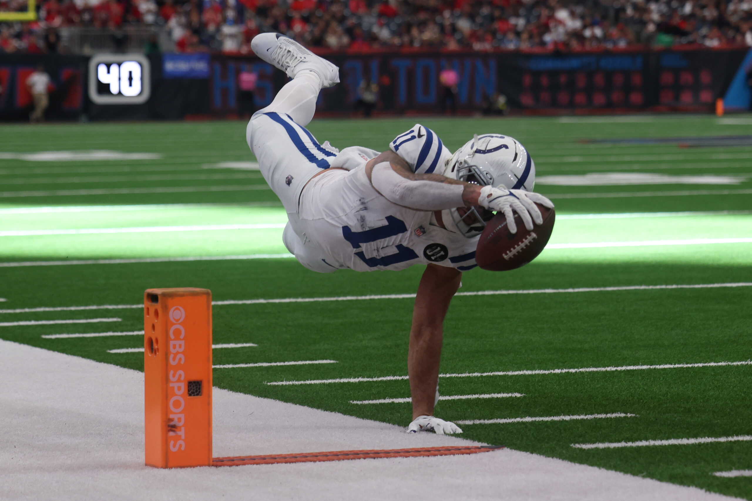 Jan 4, 2026; Houston, Texas, USA; Indianapolis Colts wide receiver Michael Pittman Jr. (11) makes the catch and dives short of the end zone Houston Texans during the second half at NRG Stadium. Mandatory Credit: Thomas Shea-Imagn Images