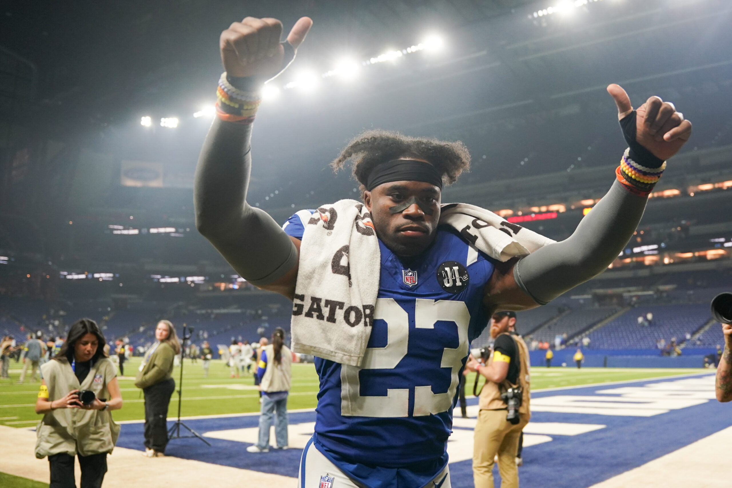 Oct 26, 2025; Indianapolis, Indiana, USA; Indianapolis Colts cornerback Kenny Moore II (23) celebrates after the game against the Tennessee Titans at Lucas Oil Stadium. Mandatory Credit: Robert Goddin-Imagn Images