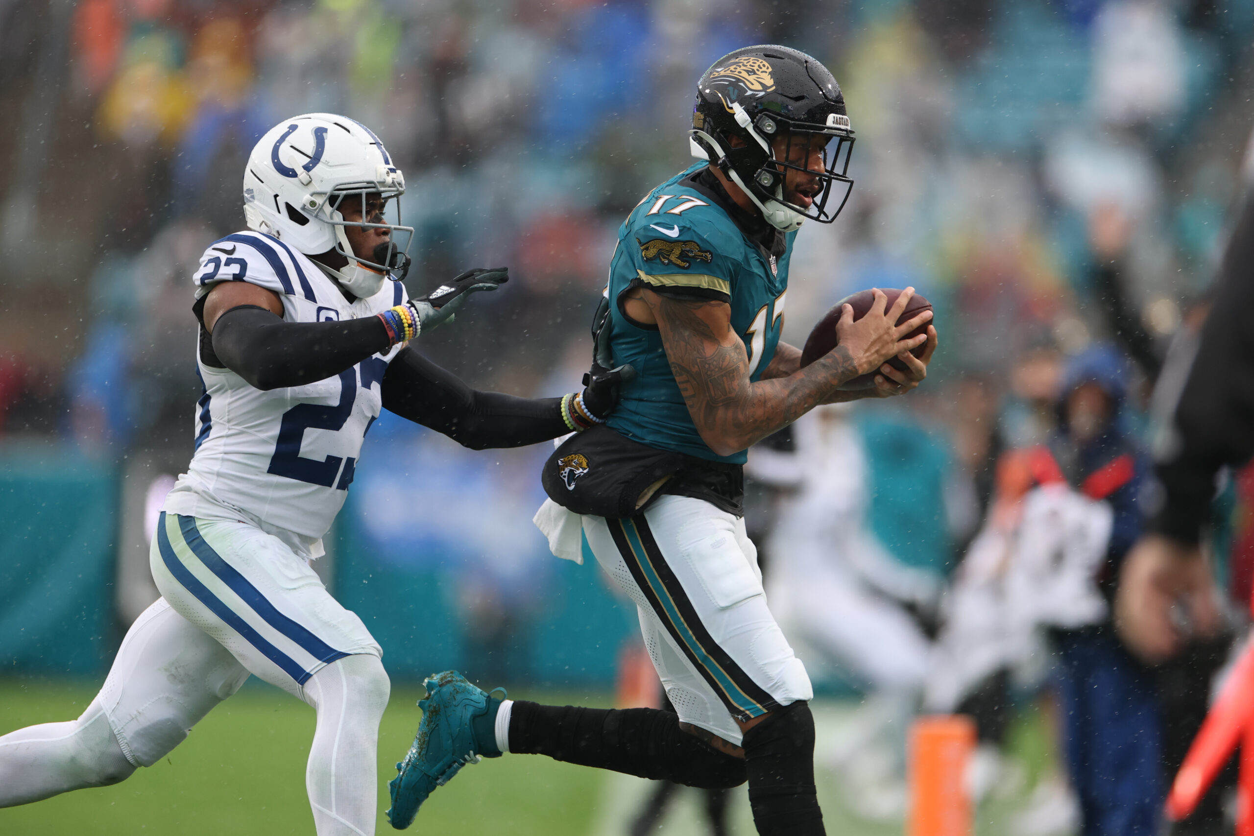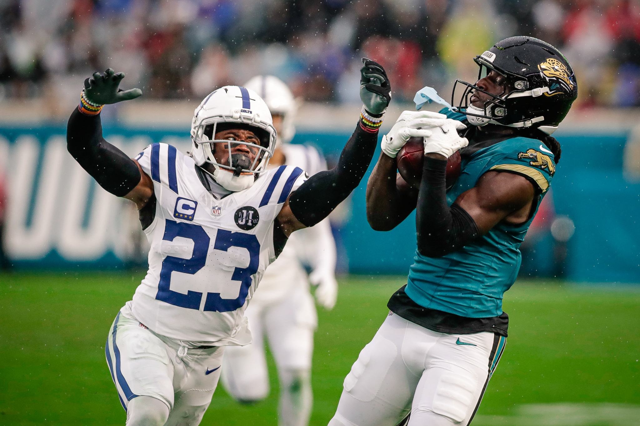 Indianapolis Colts cornerback Kenny Moore II (23) looks to bring down Jacksonville Jaguars running back Travis Etienne Jr. (1) on Sunday, Dec. 28, 2025, during a game at Lucas Oil Stadium in Indianapolis.