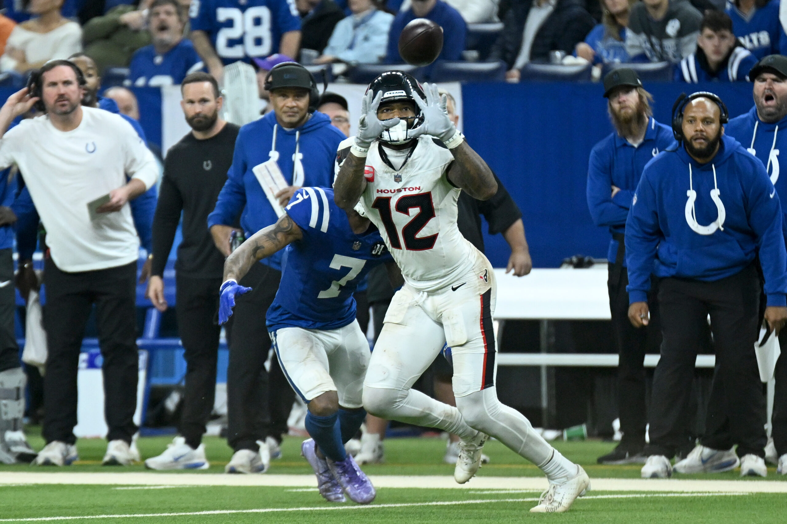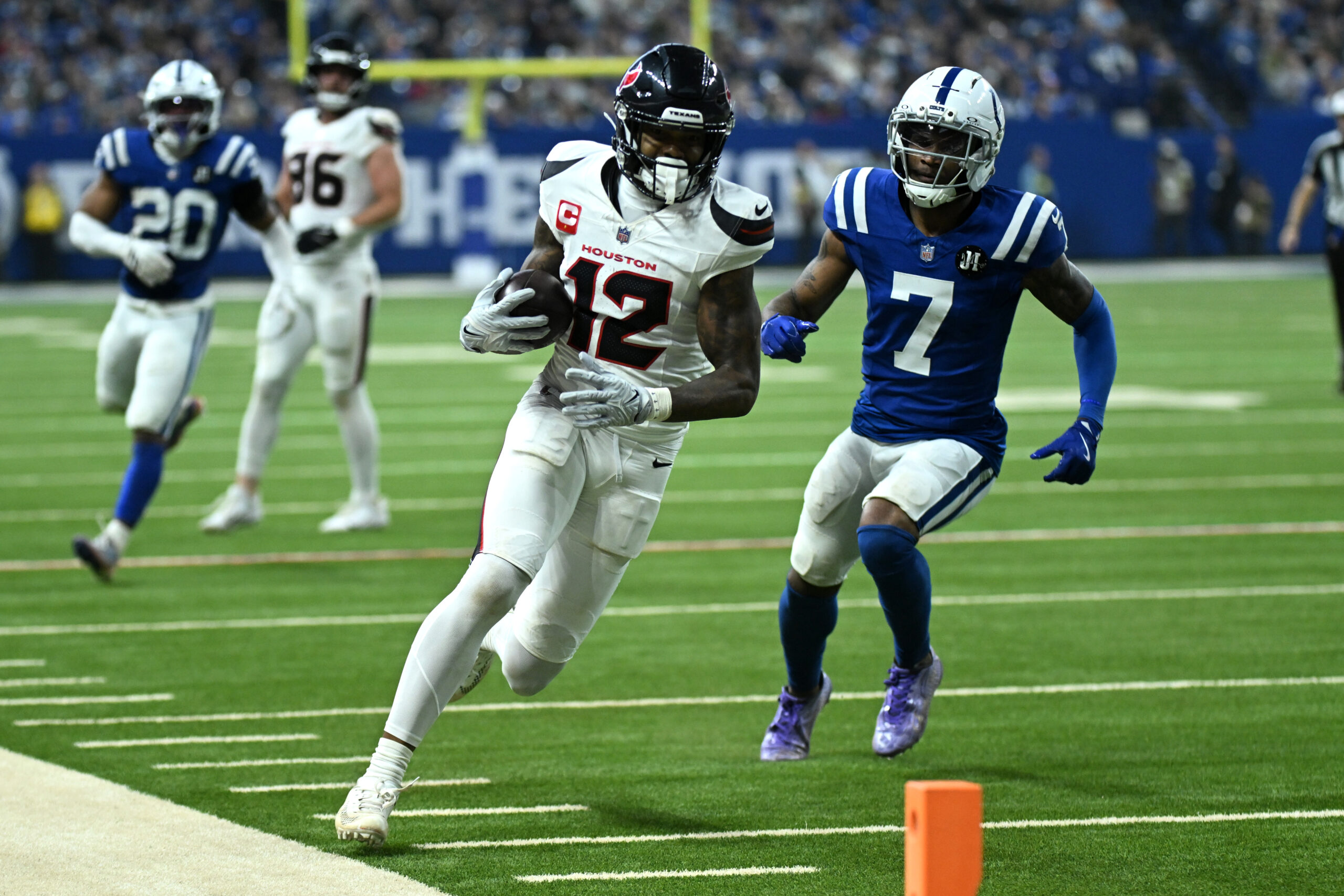 Nov 30, 2025; Indianapolis, Indiana, USA; Houston Texans wide receiver Nico Collins (12) runs after a catch against Indianapolis Colts cornerback Charvarius Ward (7) during the first half at Lucas Oil Stadium. Mandatory Credit: Robert Goddin-Imagn Images