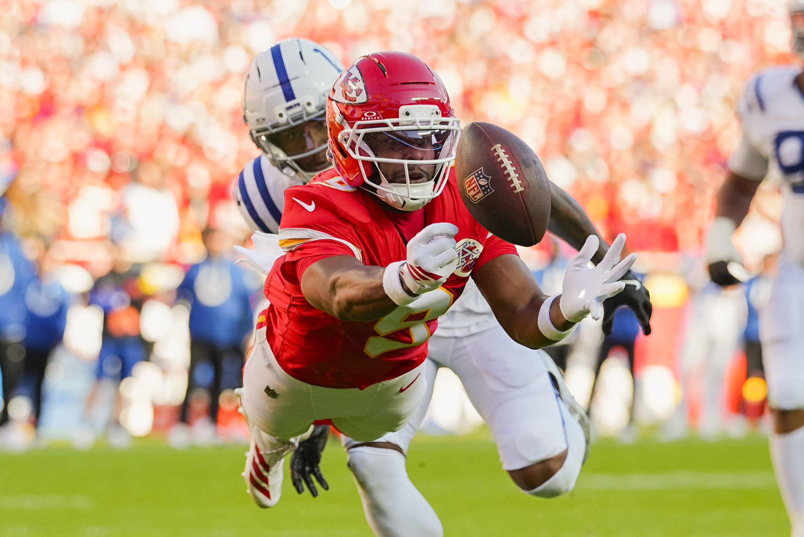 Nov 23, 2025; Kansas City, Missouri, USA; Kansas City Chiefs wide receiver JuJu Smith-Schuster (9) is unable to make the catch against Indianapolis Colts cornerback Charvarius Ward (7) during the second half at GEHA Field at Arrowhead Stadium. Mandatory Credit: Jay Biggerstaff-Imagn Images