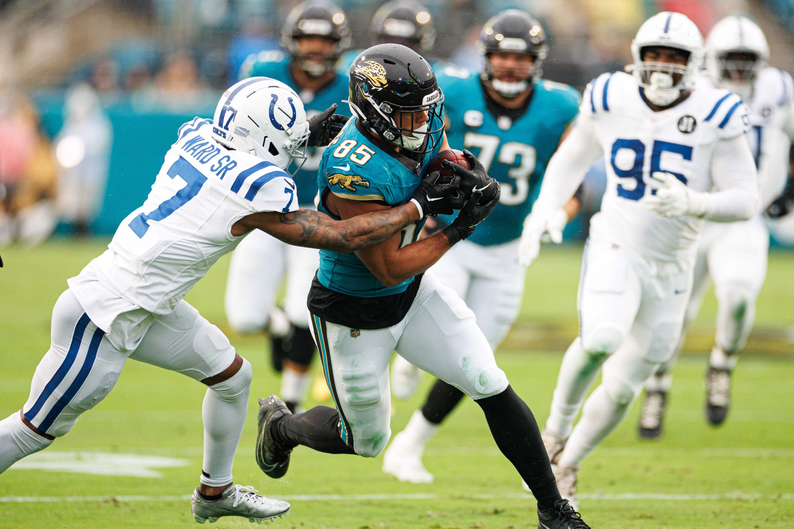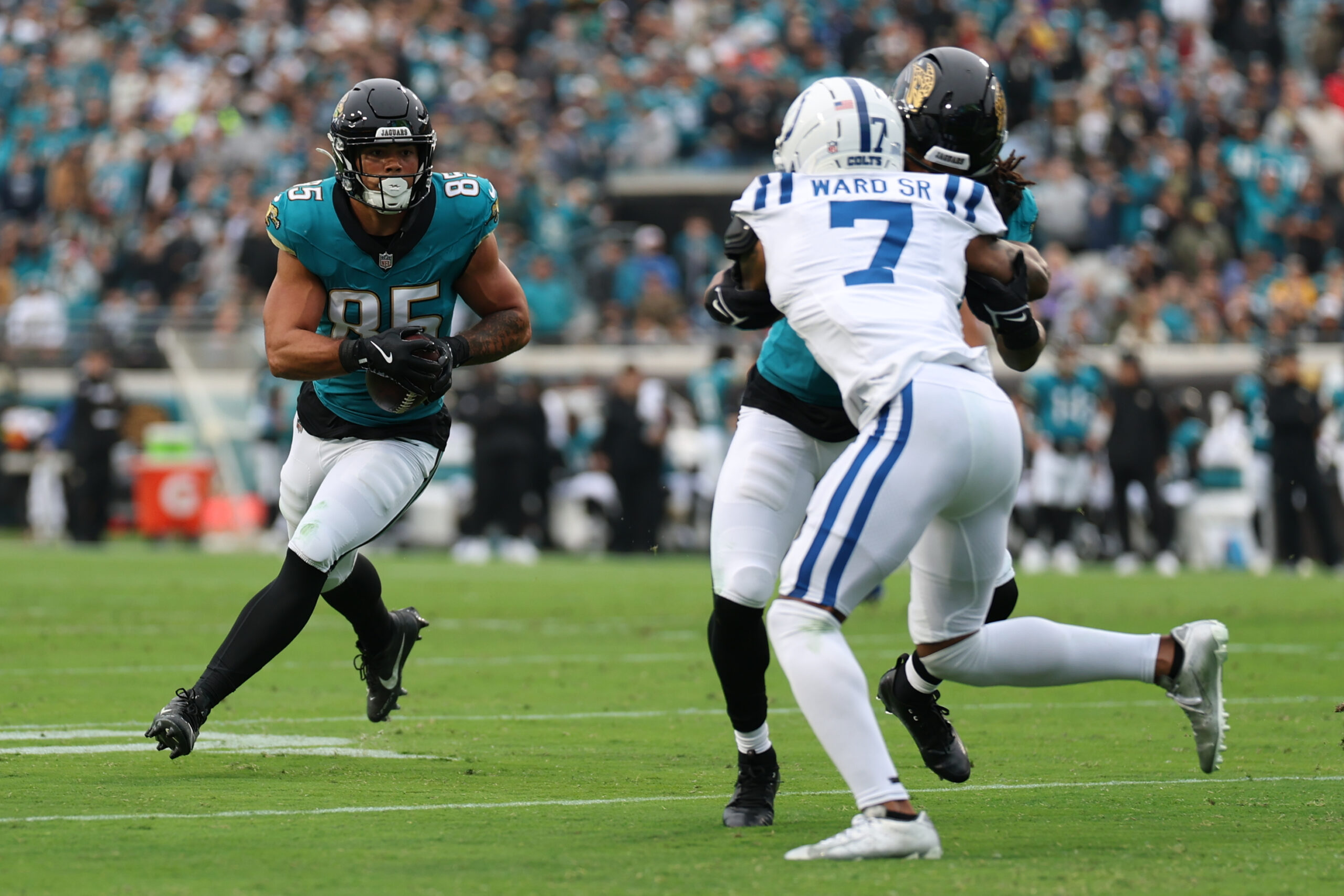 Dec 7, 2025; Jacksonville, Florida, USA; Jacksonville Jaguars tight end Brenton Strange (85) runs after the catch as Indianapolis Colts cornerback Charvarius Ward (7) pursues during the first half at EverBank Stadium. Mandatory Credit: Matt Pendleton-Imagn Images