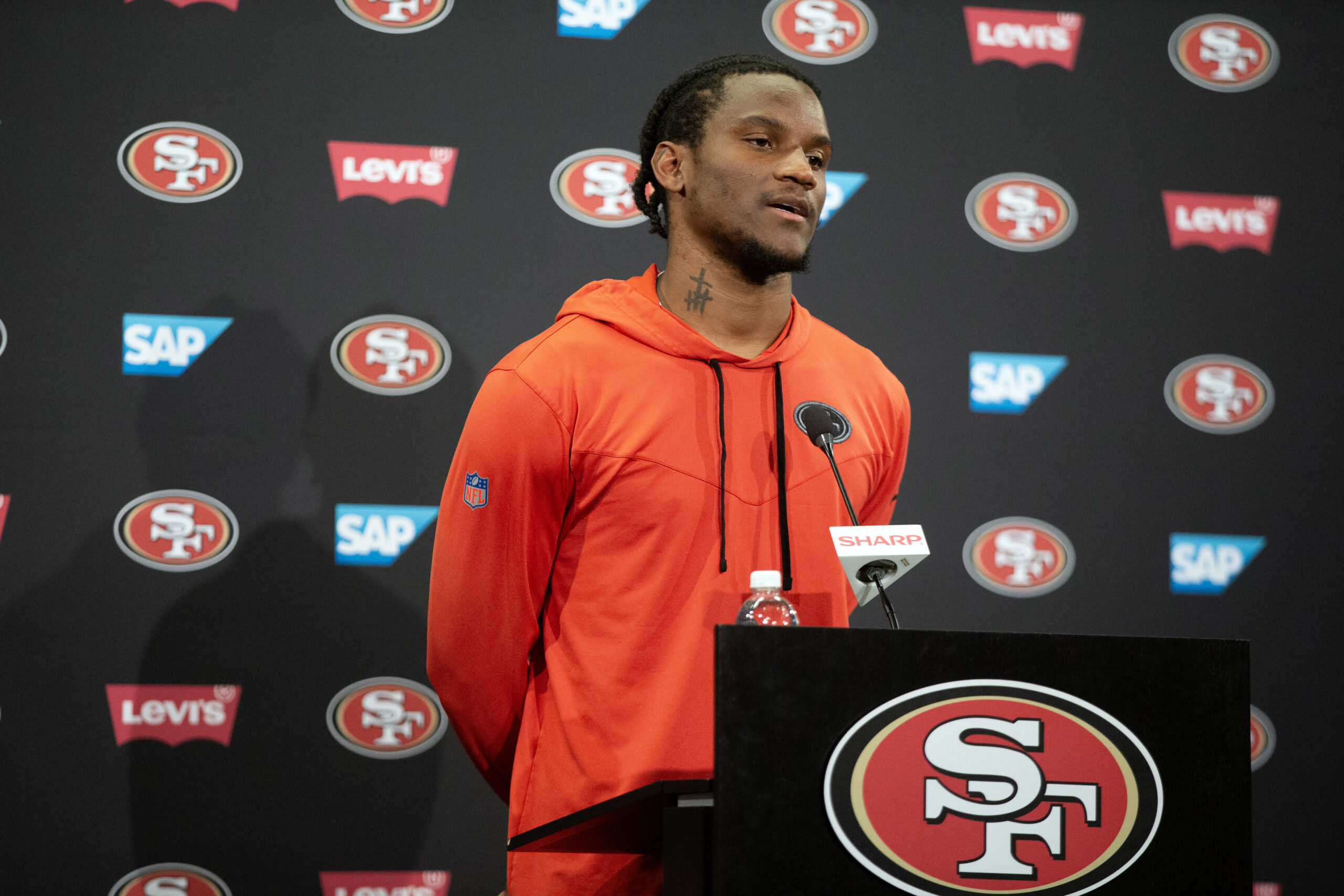 Jul 26, 2024; Santa Clara, CA, USA; San Francisco 49ers cornerback Charvarius Ward talks to the press during Day 4 of training camp at SAP Performance Facility. Mandatory Credit: D. Ross Cameron-Imagn Images